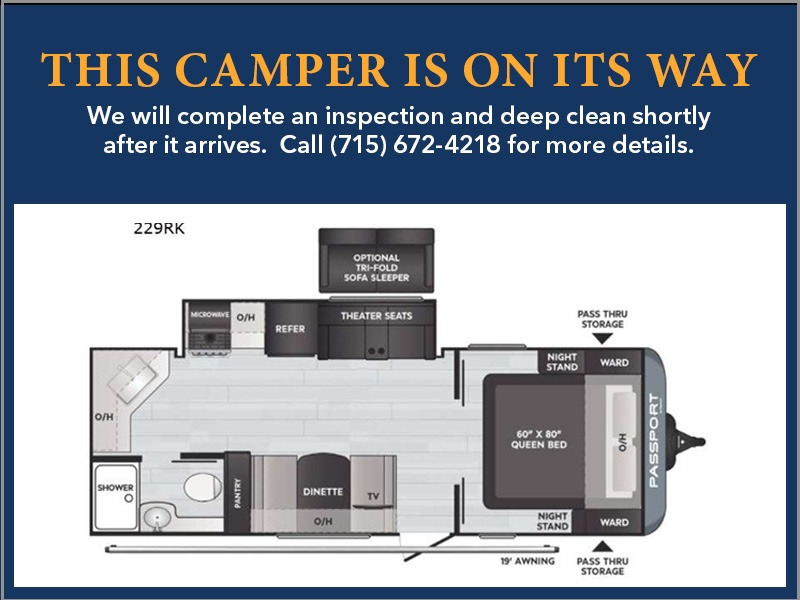 You can take many different kinds of trips with this Passport SL travel trailer! Once you get to the campsite and set up the 19' awning, you can remove your travel gear from the exterior pass-through storage to create your own little retreat. On the interior, the front private bedroom provides you with a queen-size bed, nightstands, and bedside wardrobes so that you can easily get changed every morning and night. The large slide out in the main living area will add to the amount of living space on the interior without adding to the overall width of the trailer. As the night comes to a close, you can heat up a bag of popcorn in the microwave before sitting down in the theater seating which could be switched out for the optional tri-fold sofa sleeper.
