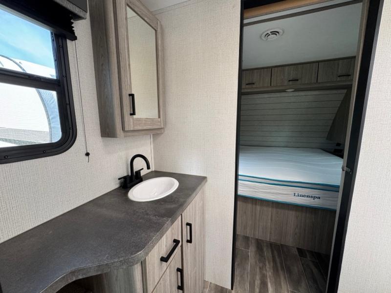 The Passport SL travel trailers by Keystone RV come in a compact design with travel-friendly lengths that are lightweight and easy to tow behind many smaller crossover SUVs. You will find several residential-style features such as durable Armstrong vinyl flooring, upgraded window treatments and valances, and bathroom countertops. The exterior shower with hot and cold water is very useful as you get cleaned up before entering the RV, wash your pets, or even rinse a few dishes outside. The Passport also now contains a HyperDeck flooring system which is a high-performance, water-resistant RV floor that comes as a breakthrough design from the Keystone Innovation Lab. This flooring is more resilient, stronger, and lighter than traditional laminated wood construction.