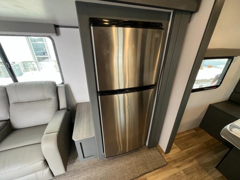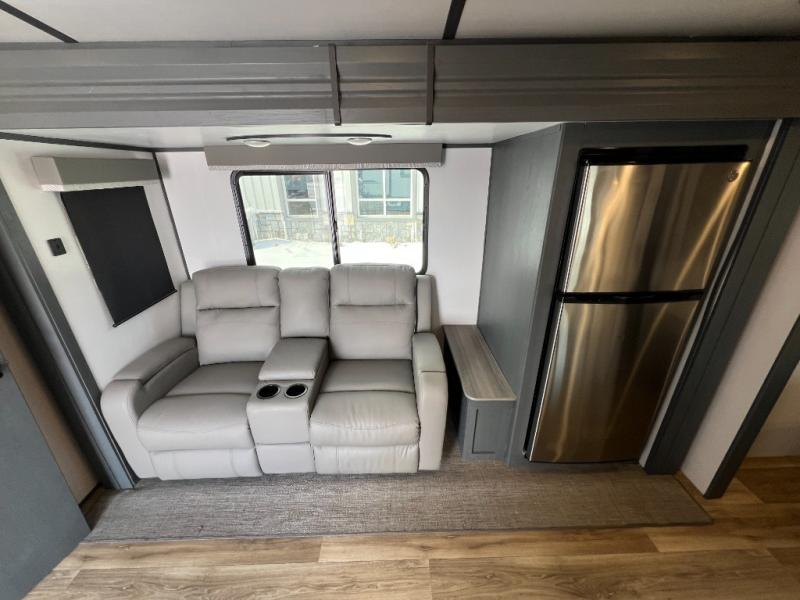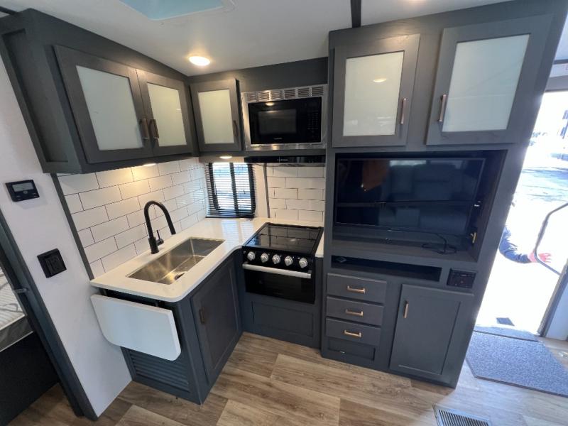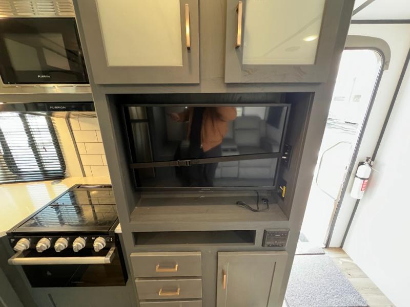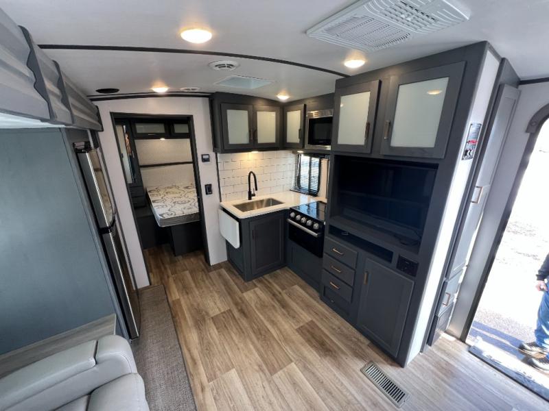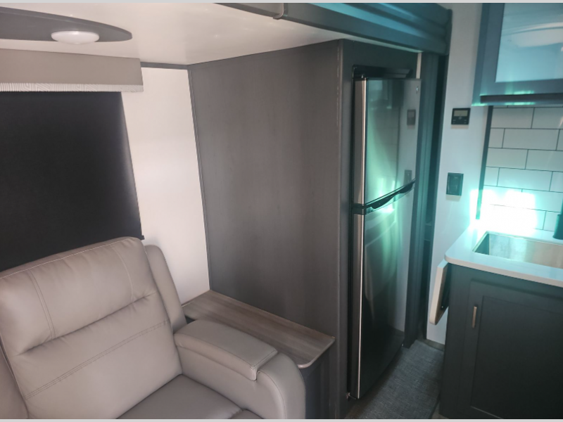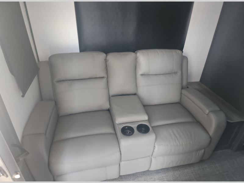 If you're looking for a lightweight travel trailer that is packed full of convenient camping features then look no further! This unit has a front private bedroom with a queen bed that has wardrobes on either side and a laundry chute that leads to the exterior pass-through storage area. The full rear bathroom has a walk-in shower with a skylight above and two linen closets to keep your towels and toiletries out of the way. The chef can choose to either cook indoors with the three burner Furrion gas range or breathe in some fresh air while cooking with the outside kitchen with a two burner cooktop, sink, mini refrigerator, and overhead cabinets for your cooking essentials. Enjoy all of your meals at the U-shaped dinette which can also transform into an extra sleeping space, but you could switch the dinette out for the optional luxury cinema recliners to relax in while watching a movie with the entertainment center!