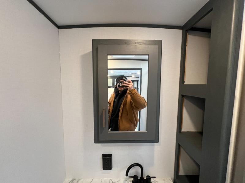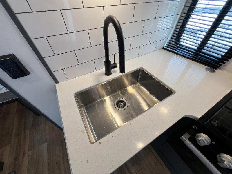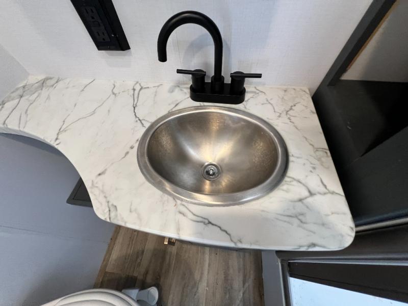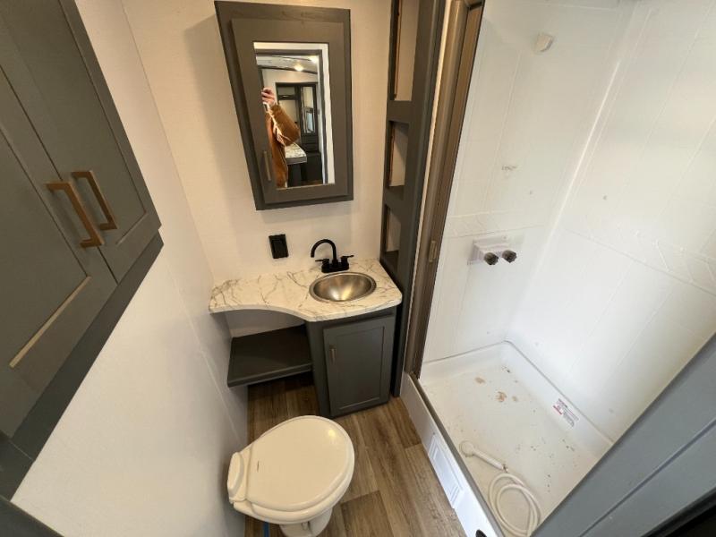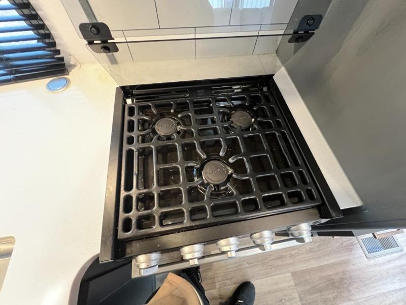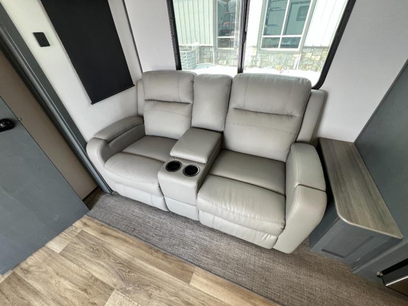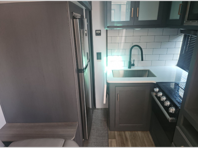 If you're looking for a lightweight travel trailer that is packed full of convenient camping features then look no further! This unit has a front private bedroom with a queen bed that has wardrobes on either side and a laundry chute that leads to the exterior pass-through storage area. The full rear bathroom has a walk-in shower with a skylight above and two linen closets to keep your towels and toiletries out of the way. The chef can choose to either cook indoors with the three burner Furrion gas range or breathe in some fresh air while cooking with the outside kitchen with a two burner cooktop, sink, mini refrigerator, and overhead cabinets for your cooking essentials. Enjoy all of your meals at the U-shaped dinette which can also transform into an extra sleeping space, but you could switch the dinette out for the optional luxury cinema recliners to relax in while watching a movie with the entertainment center!