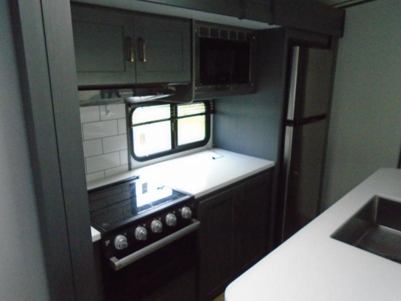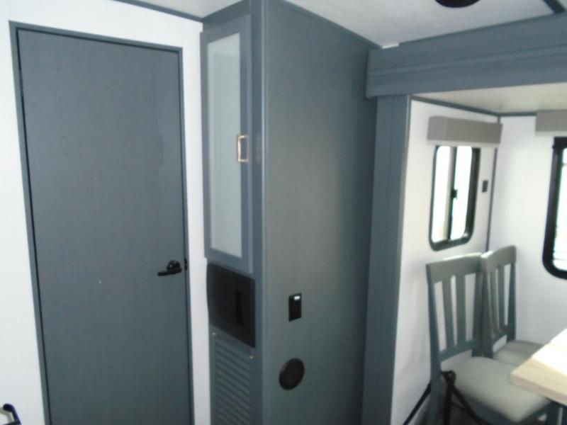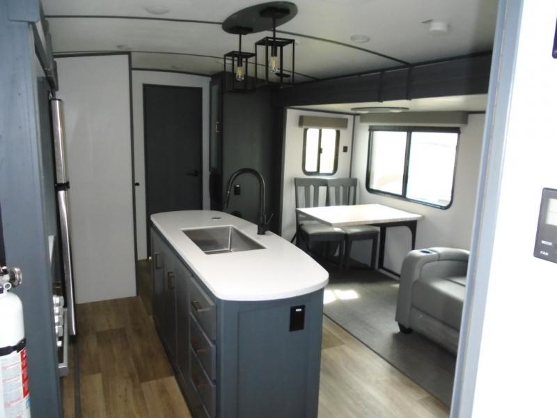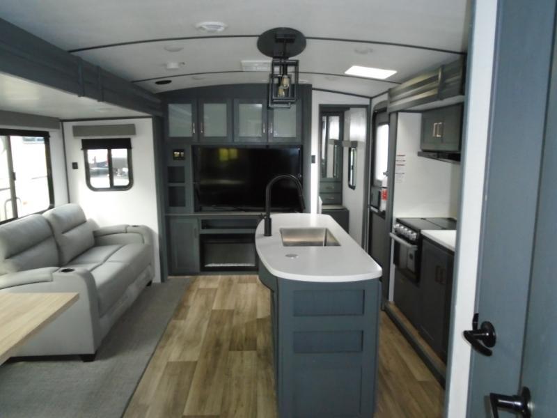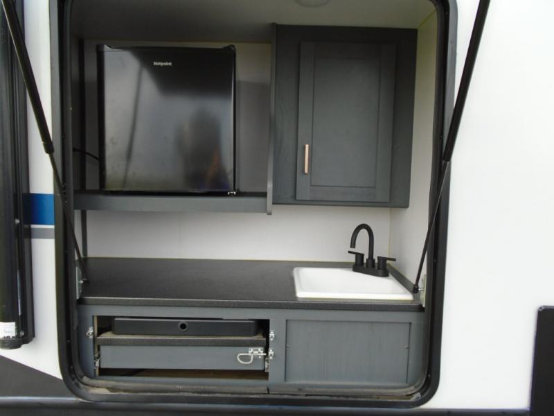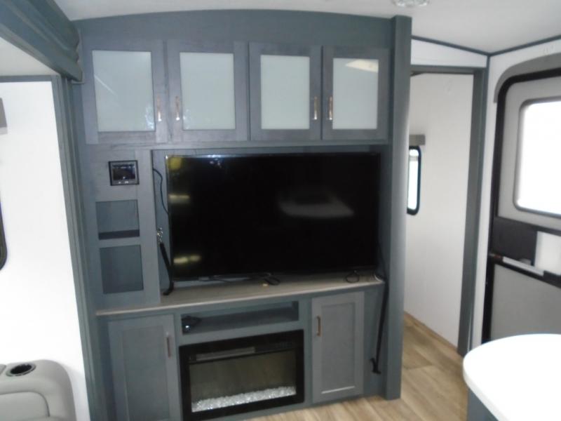 This travel trailer will be your home away from home! It features a front private bedroom with a queen bed that has wardrobes on either side and a laundry chute that leads directly to the exterior pass-through storage area. Take an afternoon nap on the 68" tri-fold sofa or enjoy a fire in the electric fireplace and watch a movie with the LCD TV at the entertainment center. Grab a snack from one of the two pantries and play some card games at the dream dinette. The kitchen island will make meal prepping easier and you can even cook dinner while breathing in some fresh air while you cook at the outside kitchen. There is also a full rear bathroom with a radius shower to rinse the sand out of your hair!