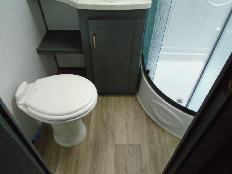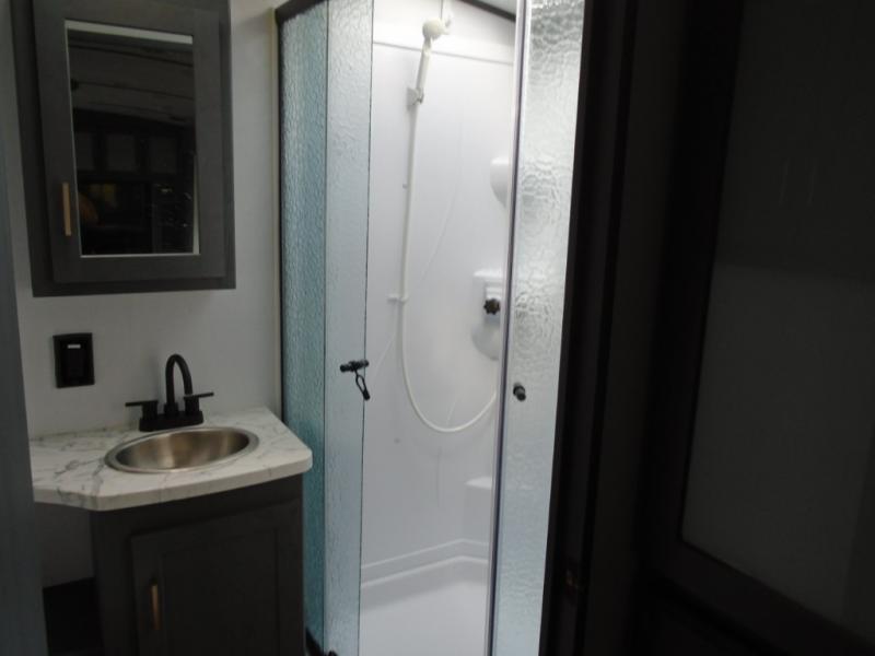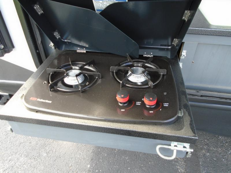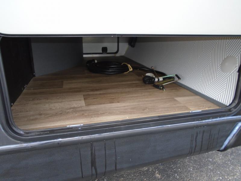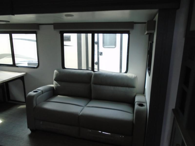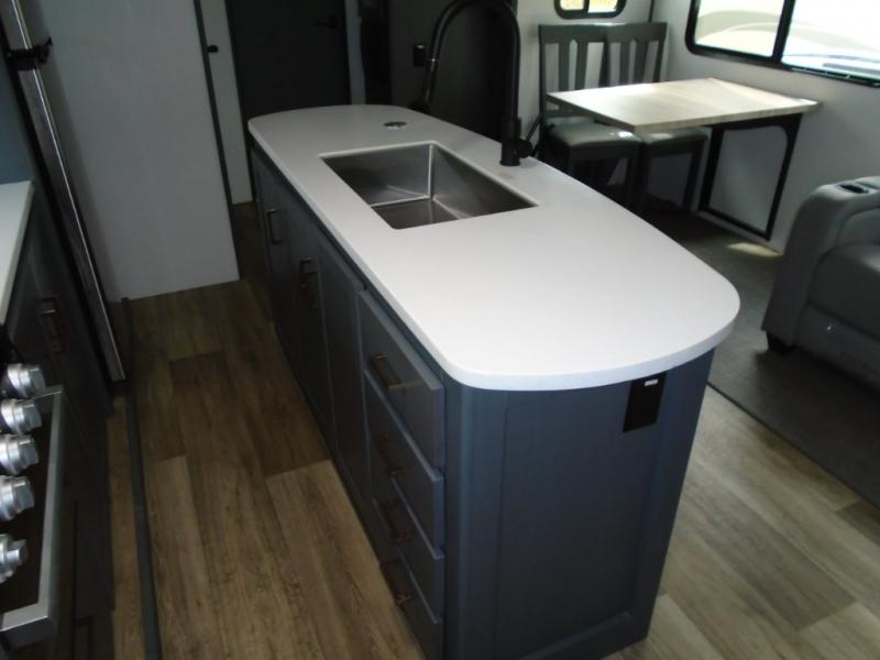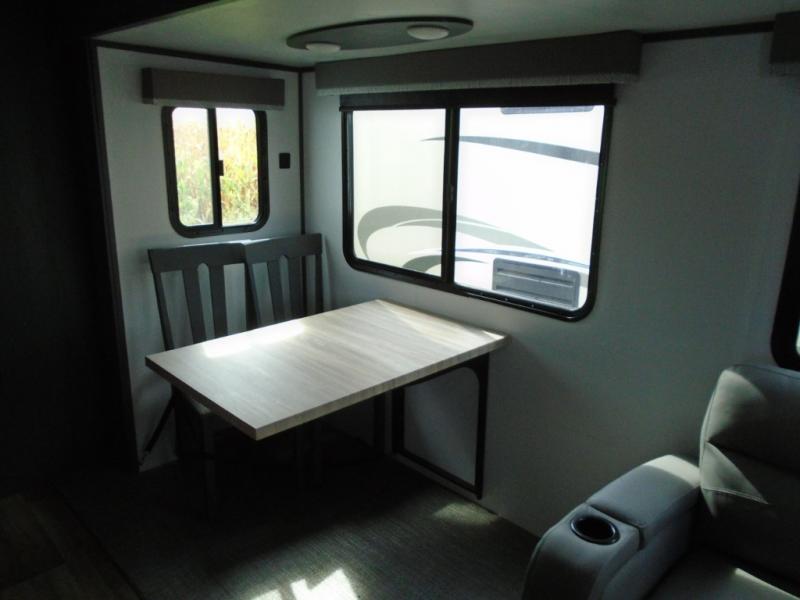 This travel trailer will be your home away from home! It features a front private bedroom with a queen bed that has wardrobes on either side and a laundry chute that leads directly to the exterior pass-through storage area. Take an afternoon nap on the 68" tri-fold sofa or enjoy a fire in the electric fireplace and watch a movie with the LCD TV at the entertainment center. Grab a snack from one of the two pantries and play some card games at the dream dinette. The kitchen island will make meal prepping easier and you can even cook dinner while breathing in some fresh air while you cook at the outside kitchen. There is also a full rear bathroom with a radius shower to rinse the sand out of your hair!