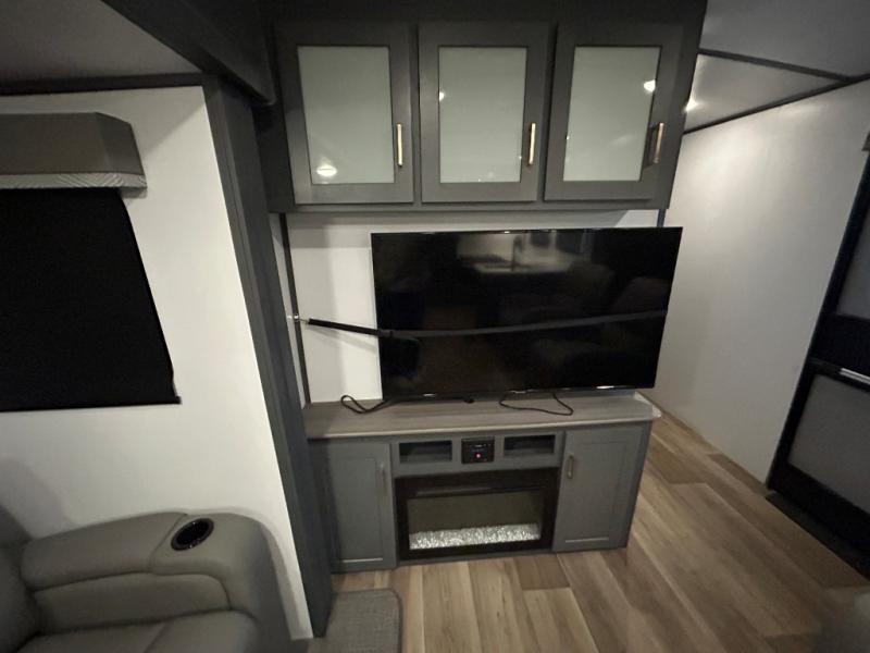 Camp in luxury with this travel trailer! The rear kitchen has plenty of countertop space for you to prepare your meals, a three burner Furrion gas range to fry up some bacon, and a 8 cu. ft. gas/electric refrigerator to keep your perishables fresh. There is even an outside kitchen with a two burner cooktop, a mini refrigerator, a sink, and an overhead cabinet all protected by the 21' electric awning. Enjoy your meals at the dream dinette and relax in either one of the two recliners or on the 68" tri-fold sofa while your stomach settles. The entertainment center has an electric fireplace and a LCD TV for you to watch your favorite movies. When you're ready to wind down your night, take a relaxing shower in the 36" tub/shower and then lay down on the queen bed in the front private bedroom!