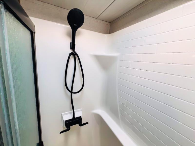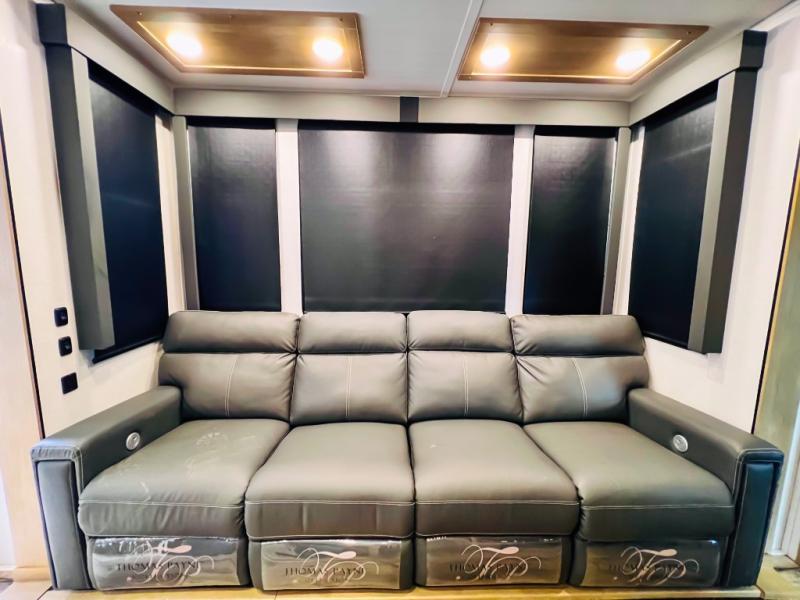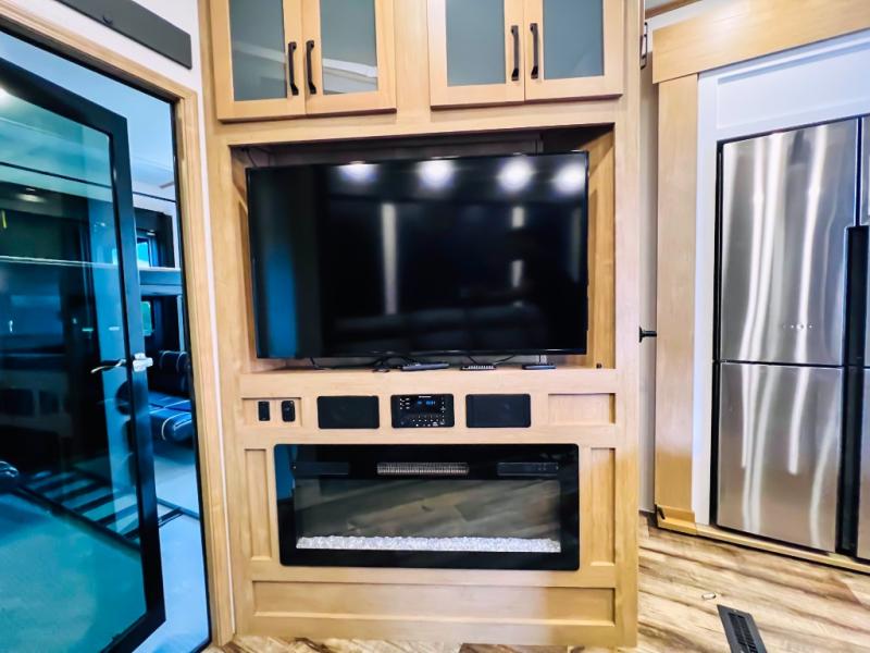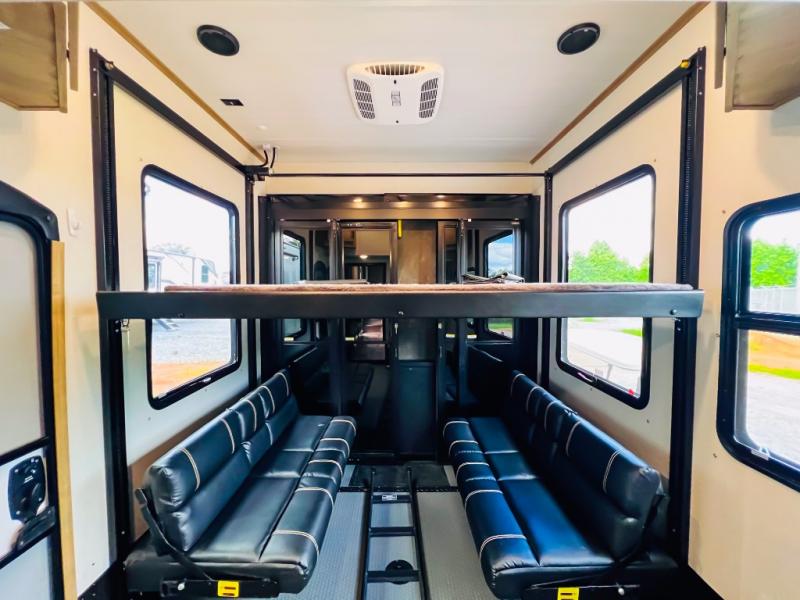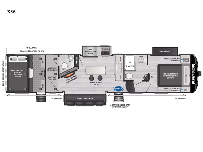 Pack your bags and load up your toys into the 11' garage area of this toy hauler! Once you have arrived, you can set up the electric bed above the dual opposing sofas with a table in between, the loft with twin bed, the half bathroom, and there is even an area prepped to add an optional washer and dryer. Relax on the 4-seat recliner slide across from the entertainment center with a fireplace or whip up a meal with the three burner cooktop, convection microwave, and 18 cu. ft. refrigerator. The kitchen island not only provides extra countertop space for meal prep, but also a comfortable place to enjoy your morning coffee with two flip-up bar stools. You can easily access the dual entry bathroom especially if you are staying in the front private bedroom which has a residential queen bed that can be switched out for a Raptor king bed, a wardrobe slide, and wireless phone chargers at the nightstands on either side of the bed!