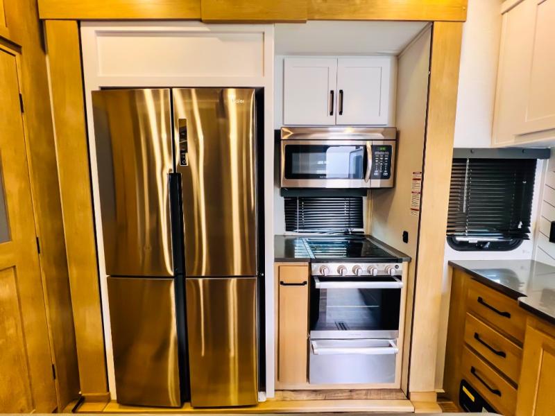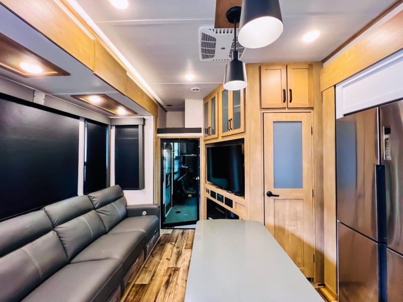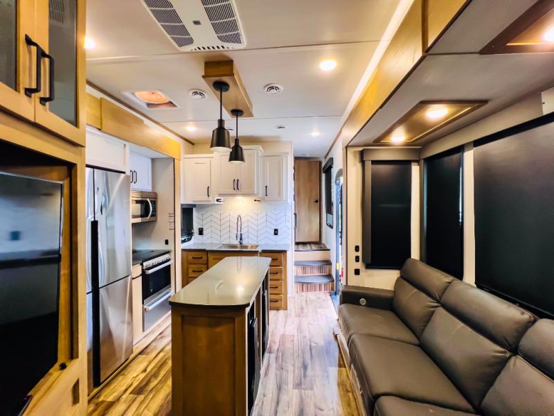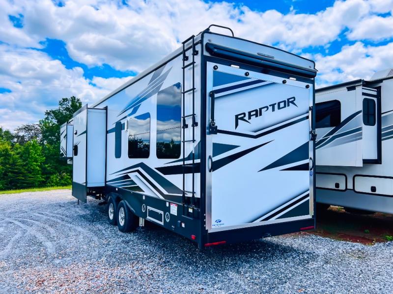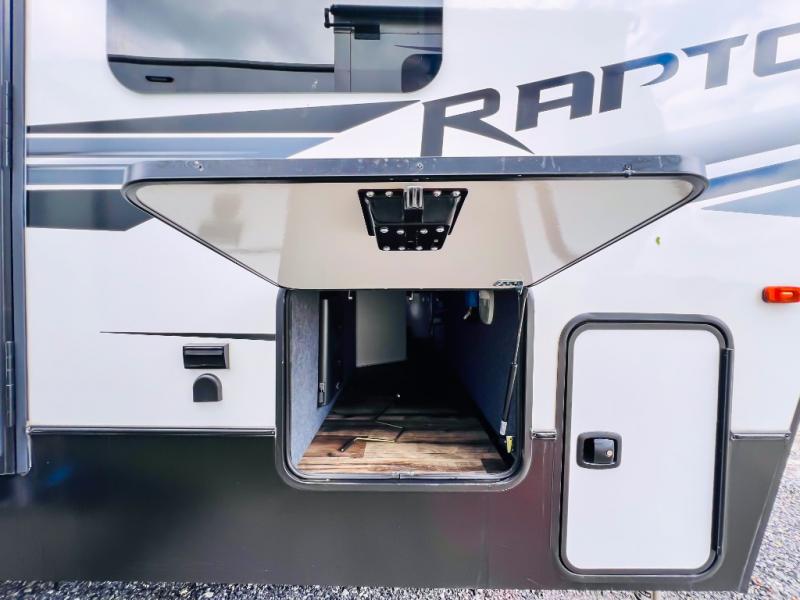 Experience a breath of fresh air with one of these Keystone RV Raptor fifth wheel toy haulers! Their rugged construction consists of a walkable one-piece Alpha Super Flex TPO roof with aluminum flashing, G-rated tires, Dyna Span floor decking, and frame-welded tie downs to keep your toys in place as you travel. With an on-demand water heater, you can have an endless amount of hot water when you need it. Some unexpected conveniences you will appreciate include an Omni-Chill A/C system to keep you cool on those hot summer days, a Furrion backup camera and HitchVision to prevent damages, and a Generation 3 iN-Command smart automation system with Global Command to make life easier. Soft-close hardwood cabinetry makes for a quiet closure to enjoy undetected late night snacking, and the MORryde zero-gravity ramp door makes it easy to load an unload your toys. Come find the right one for you today!