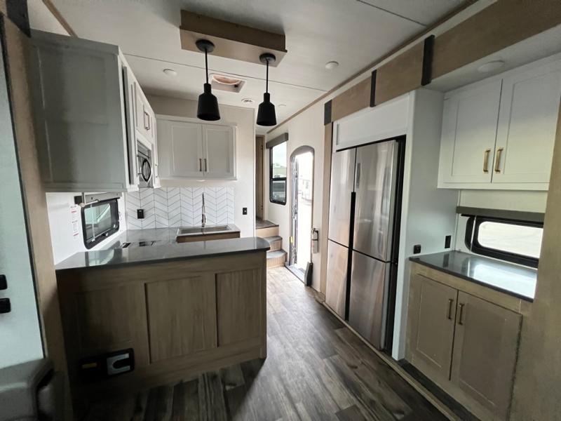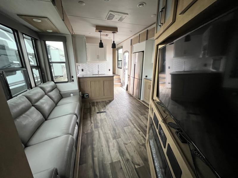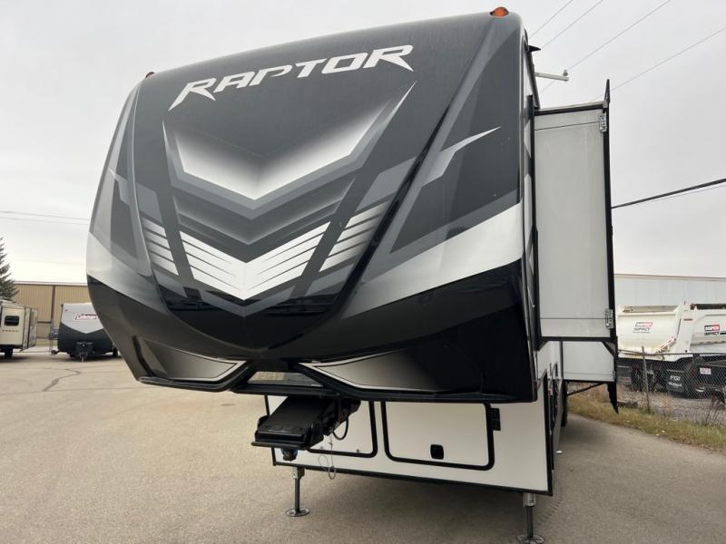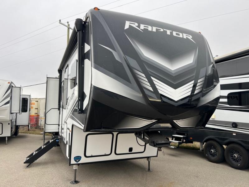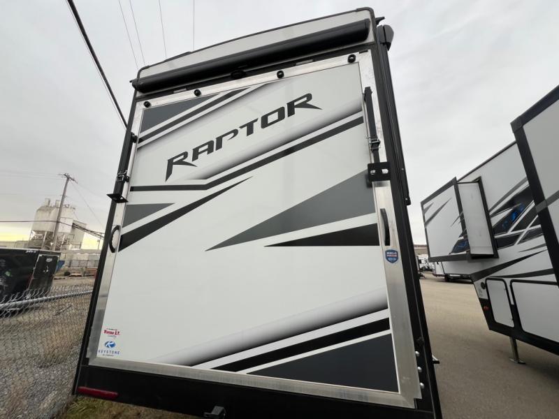 Experience a breath of fresh air with one of these Keystone RV Raptor fifth wheel toy haulers! Their rugged construction consists of a walkable one-piece Alpha Super Flex TPO roof with aluminum flashing, G-rated tires, Dyna Span floor decking, and frame-welded tie downs to keep your toys in place as you travel. With an on-demand water heater, you can have an endless amount of hot water when you need it. Some unexpected conveniences you will appreciate include an Omni-Chill A/C system to keep you cool on those hot summer days, a Furrion backup camera and HitchVision to prevent damages, and a Generation 3 iN-Command smart automation system with Global Command to make life easier. Soft-close hardwood cabinetry makes for a quiet closure to enjoy undetected late night snacking, and the MORryde zero-gravity ramp door makes it easy to load an unload your toys. Come find the right one for you today!