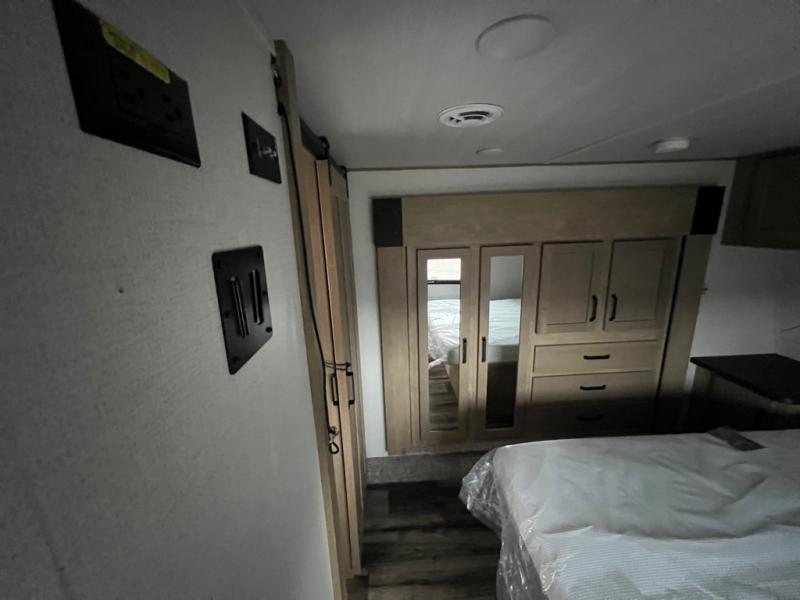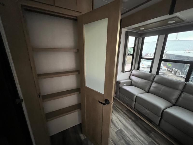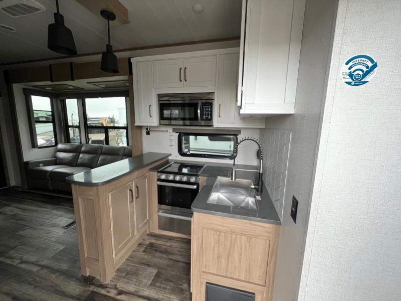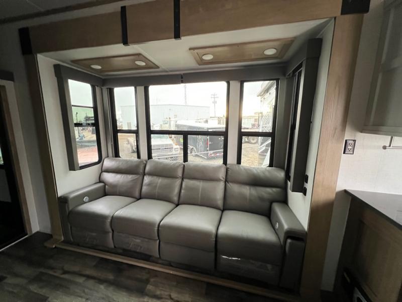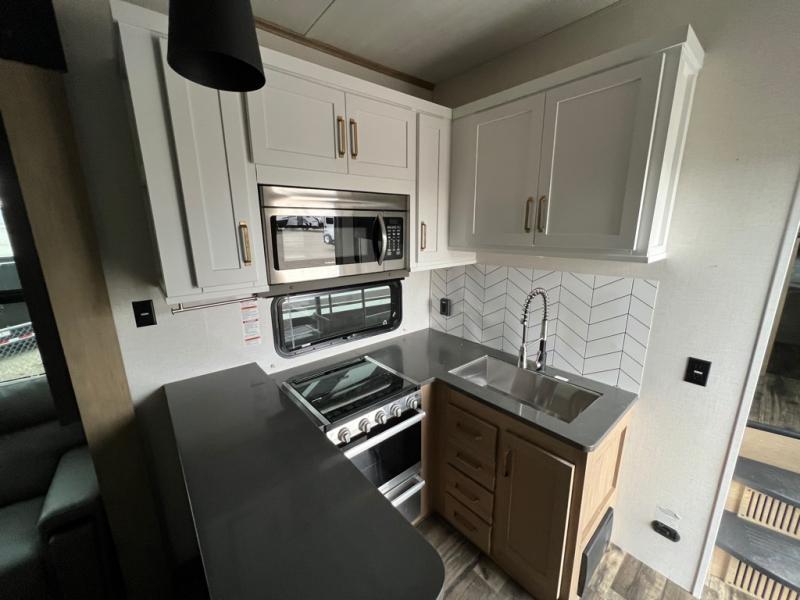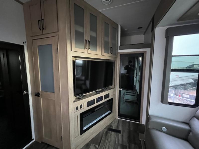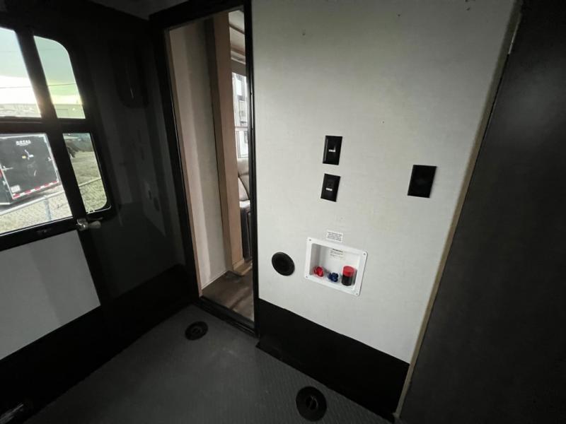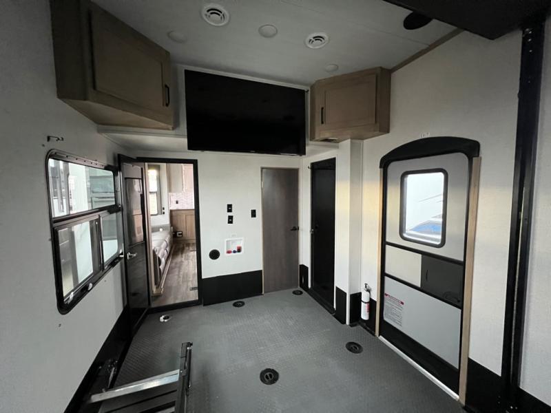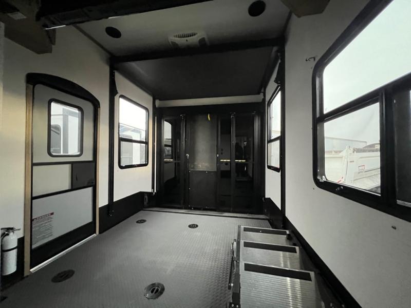 You will be the talk of the campground with a 118" side patio and outside TV on this toy hauler! As you enter the 13' garage area, you will notice an electric bed above dual opposing sofas with a table in between for meals or games, a loft with twin bed, a half bathroom, and even an area prepped to add an optional washer and dryer. The 4-seat recliner slide is across from the entertainment center with a 50" LED TV and fireplace for a cozy evening indoors. Prepare your best meals with the three burner cooktop in the U-shaped kitchen and freshen up each morning in the dual entry bathroom with the shower. The bathroom also leads directly into the front private bedroom which has a residential queen bed that can be switched out for an optional Raptor king bed, wireless phone chargers on either side of it, and a wardrobe slide to keep your clothes looking their best!