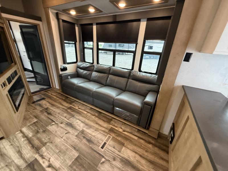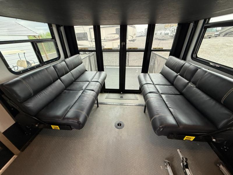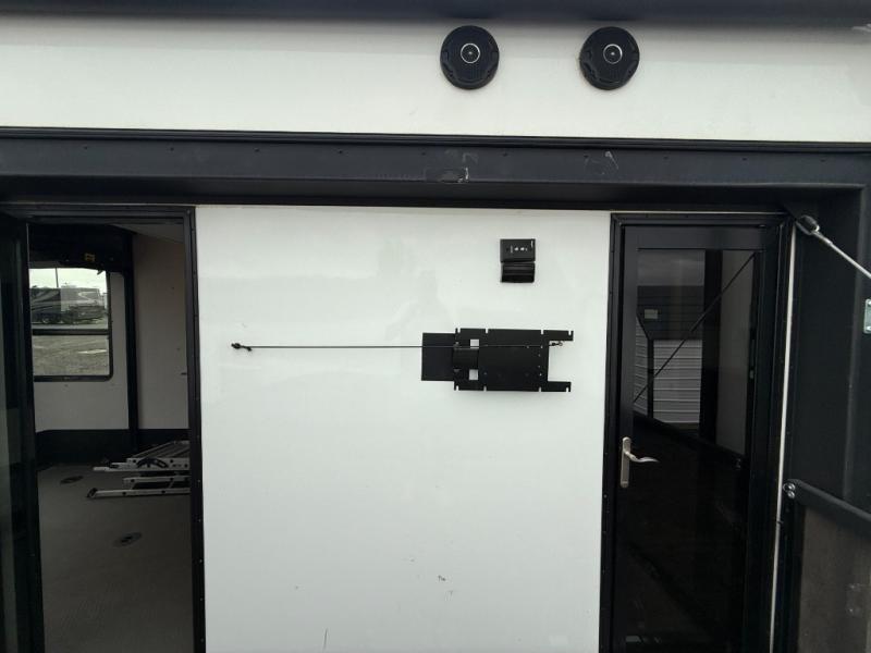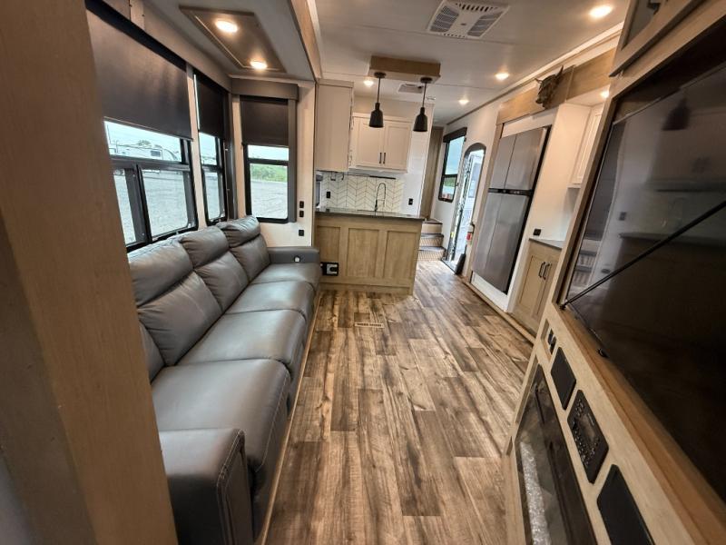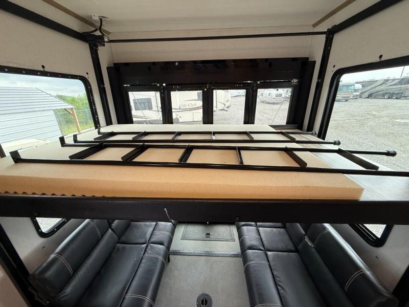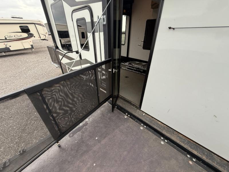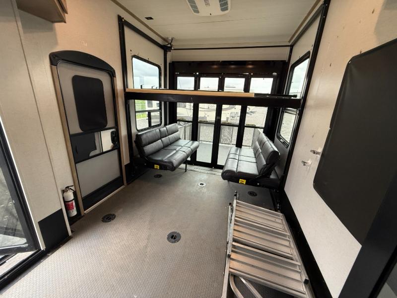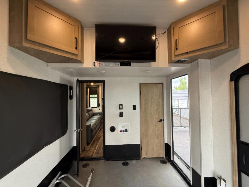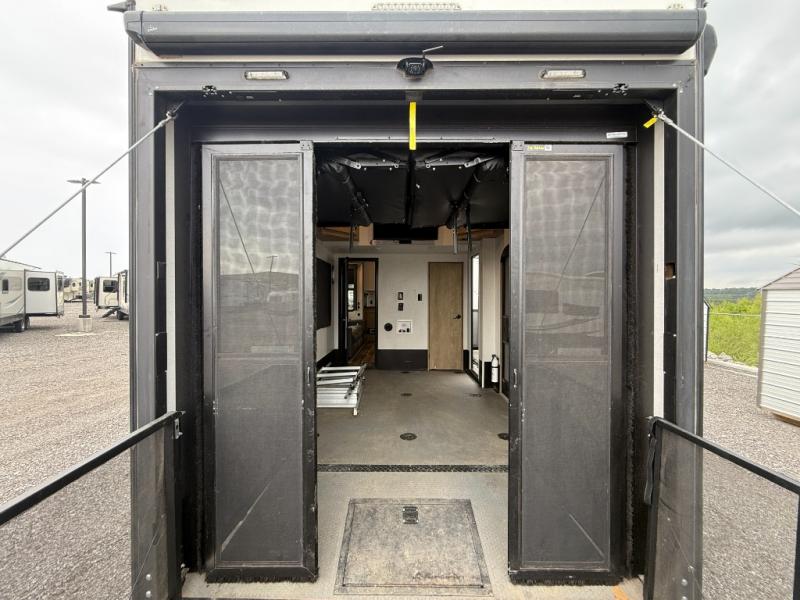 You will be the talk of the campground with a 118" side patio and outside TV on this toy hauler! As you enter the 13' garage area, you will notice an electric bed above dual opposing sofas with a table in between for meals or games, a loft with twin bed, a half bathroom, and even an area prepped to add an optional washer and dryer. The 4-seat recliner slide is across from the entertainment center with a 50" LED TV and fireplace for a cozy evening indoors. Prepare your best meals with the three burner cooktop in the U-shaped kitchen and freshen up each morning in the dual entry bathroom with the shower. The bathroom also leads directly into the front private bedroom which has a residential queen bed that can be switched out for an optional Raptor king bed, wireless phone chargers on either side of it, and a wardrobe slide to keep your clothes looking their best!
