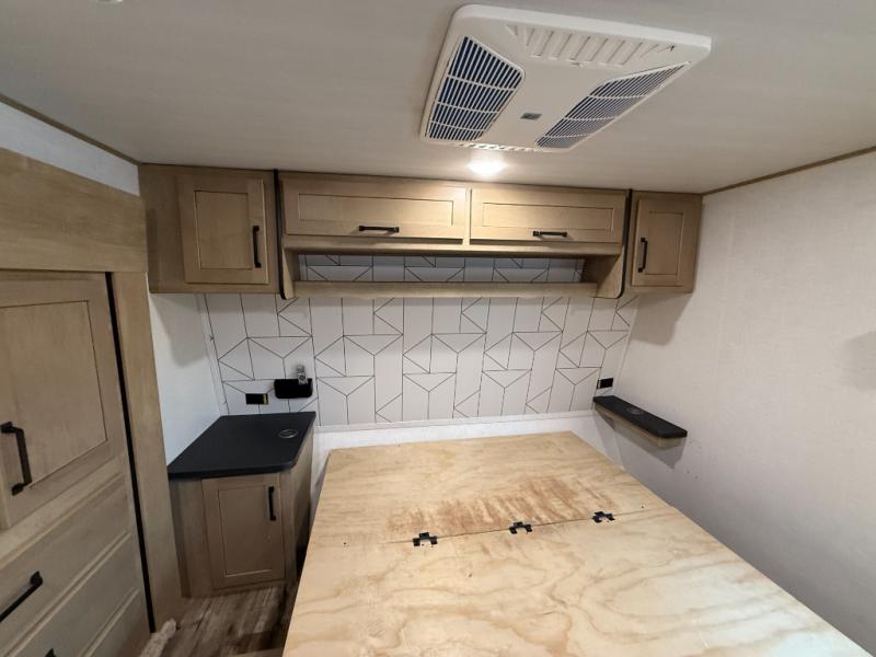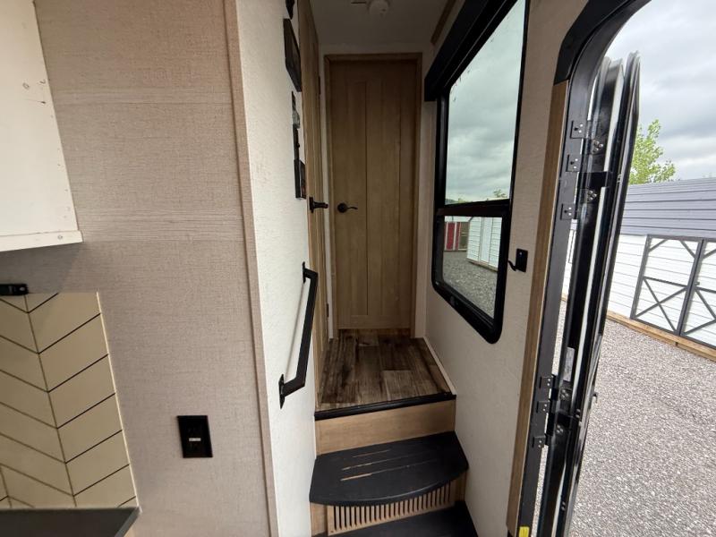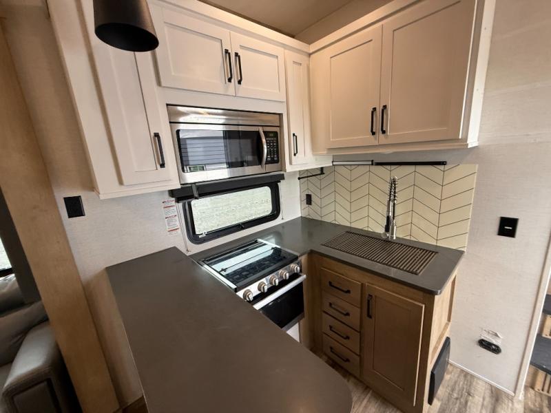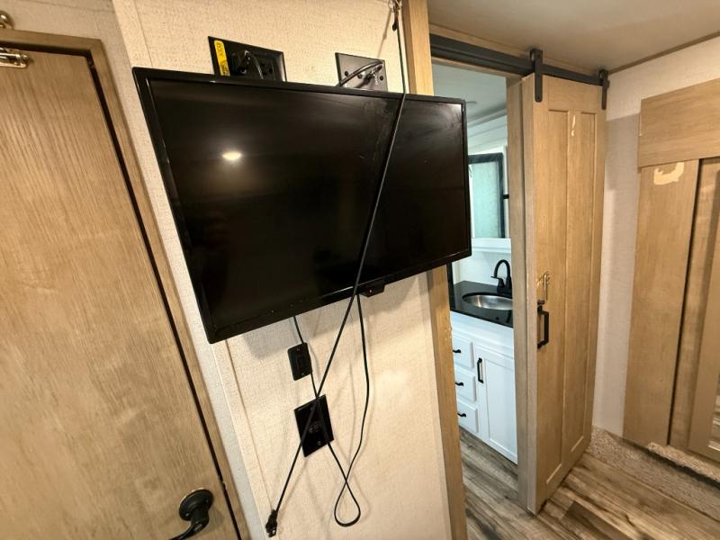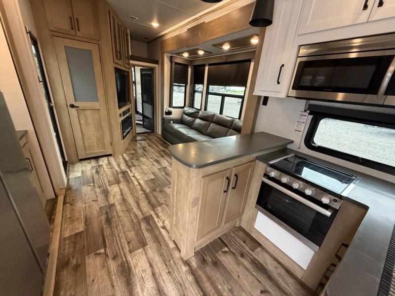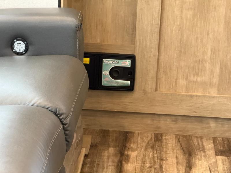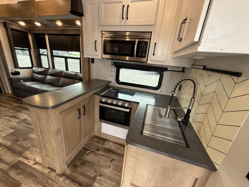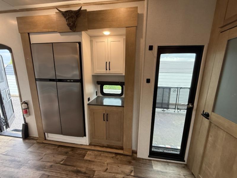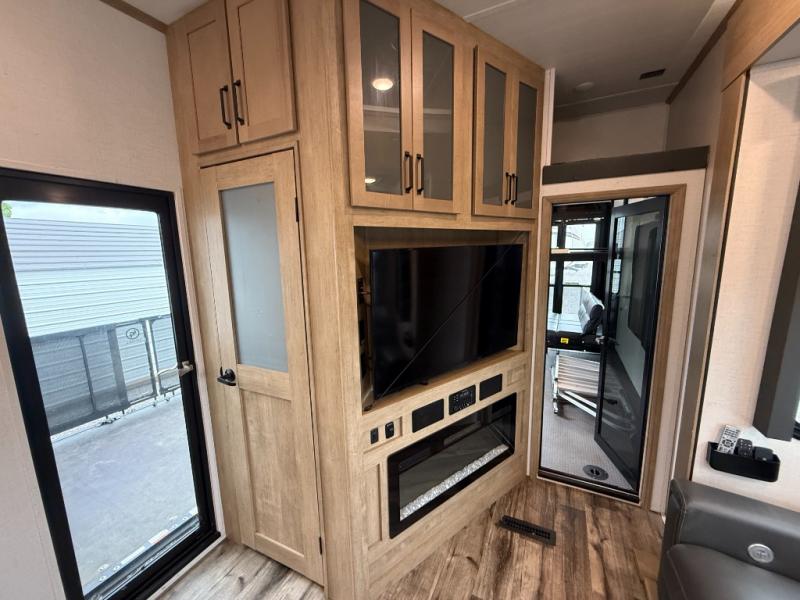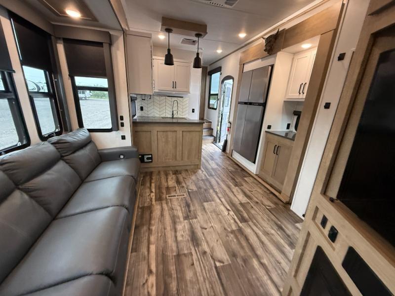 You will be the talk of the campground with a 118" side patio and outside TV on this toy hauler! As you enter the 13' garage area, you will notice an electric bed above dual opposing sofas with a table in between for meals or games, a loft with twin bed, a half bathroom, and even an area prepped to add an optional washer and dryer. The 4-seat recliner slide is across from the entertainment center with a 50" LED TV and fireplace for a cozy evening indoors. Prepare your best meals with the three burner cooktop in the U-shaped kitchen and freshen up each morning in the dual entry bathroom with the shower. The bathroom also leads directly into the front private bedroom which has a residential queen bed that can be switched out for an optional Raptor king bed, wireless phone chargers on either side of it, and a wardrobe slide to keep your clothes looking their best!