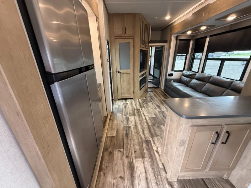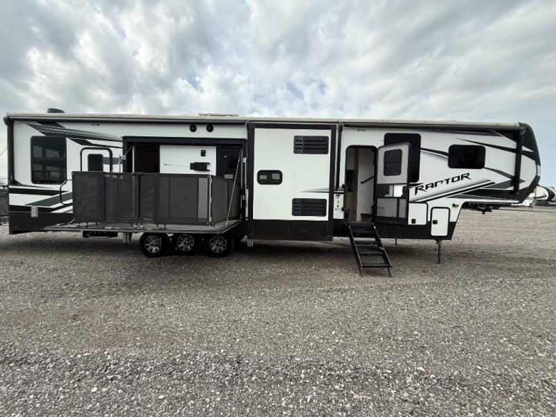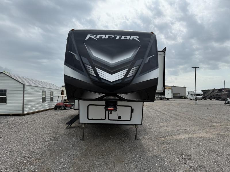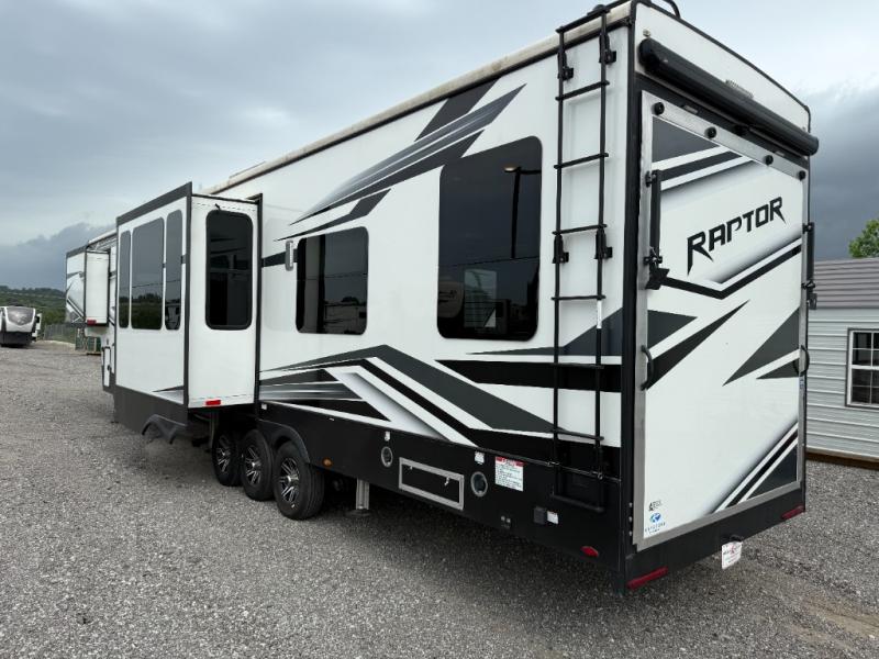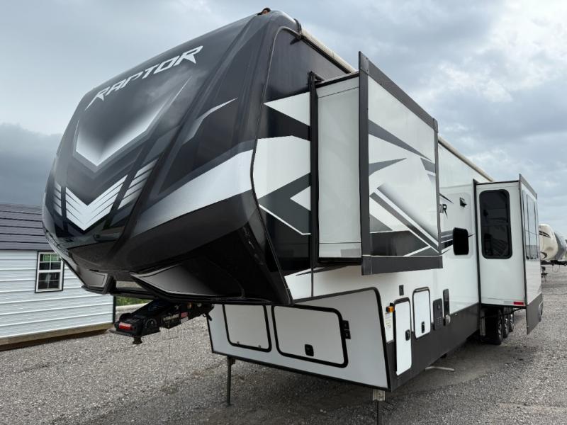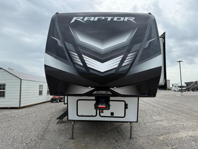Experience a breath of fresh air with one of these Keystone RV Raptor fifth wheel toy haulers! Their rugged construction consists of a walkable one-piece Alpha Super Flex TPO roof with aluminum flashing, G-rated tires, Dyna Span floor decking, and frame-welded tie downs to keep your toys in place as you travel. With an on-demand water heater, you can have an endless amount of hot water when you need it. Some unexpected conveniences you will appreciate include an Omni-Chill A/C system to keep you cool on those hot summer days, a Furrion backup camera and HitchVision to prevent damages, and a Generation 3 iN-Command smart automation system with Global Command to make life easier. Soft-close hardwood cabinetry makes for a quiet closure to enjoy undetected late night snacking, and the MORryde zero-gravity ramp door makes it easy to load an unload your toys. Come find the right one for you today!