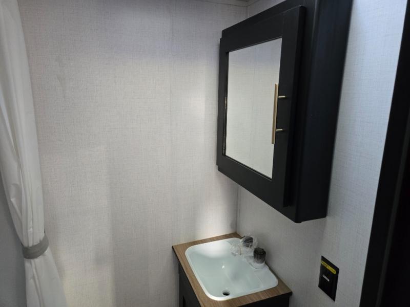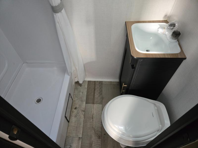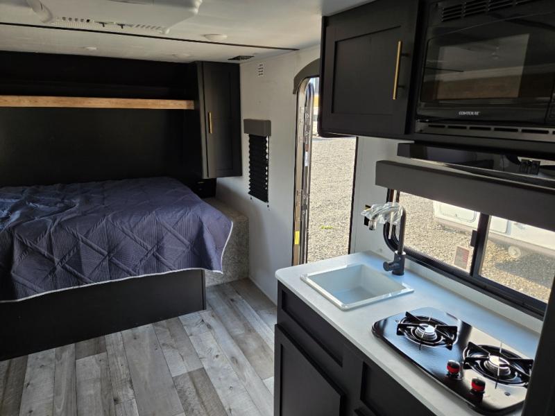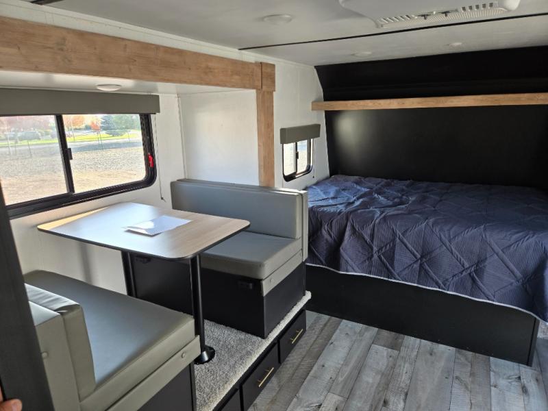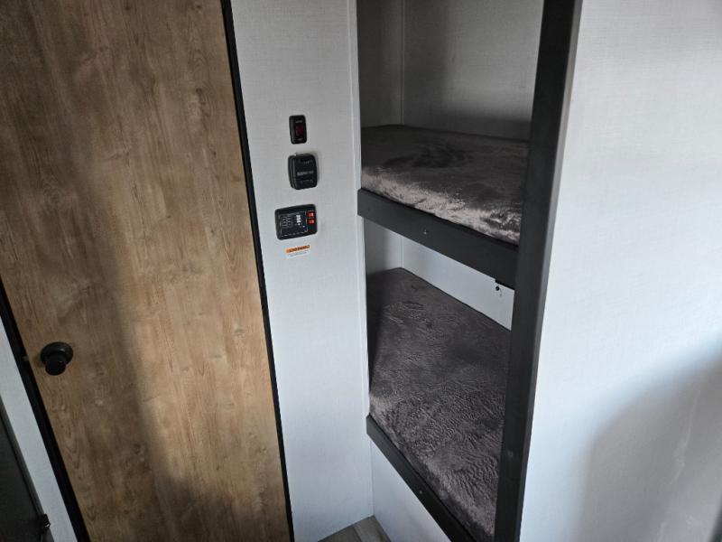 When you say "Camping" your kids will immediately think about sleeping on the 30" x 68" bunk beds and playing outdoors! There is something about planning the trip that gets everyone excited, and once at your campsite, the excitement grows. You will have your own bed up front as well as a closet and nightstand for your things. The booth dinette doubles as sleeping space and includes drawers for storage, plus the slide provides more floor space. The cook can make warm meals in the galley kitchen, and the full bathroom will keep everyone refreshed and ready for the next day.