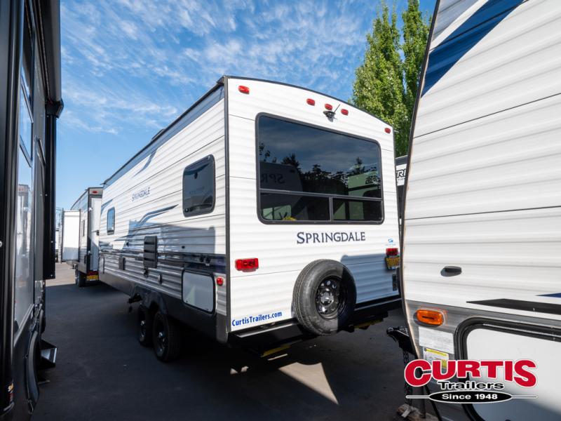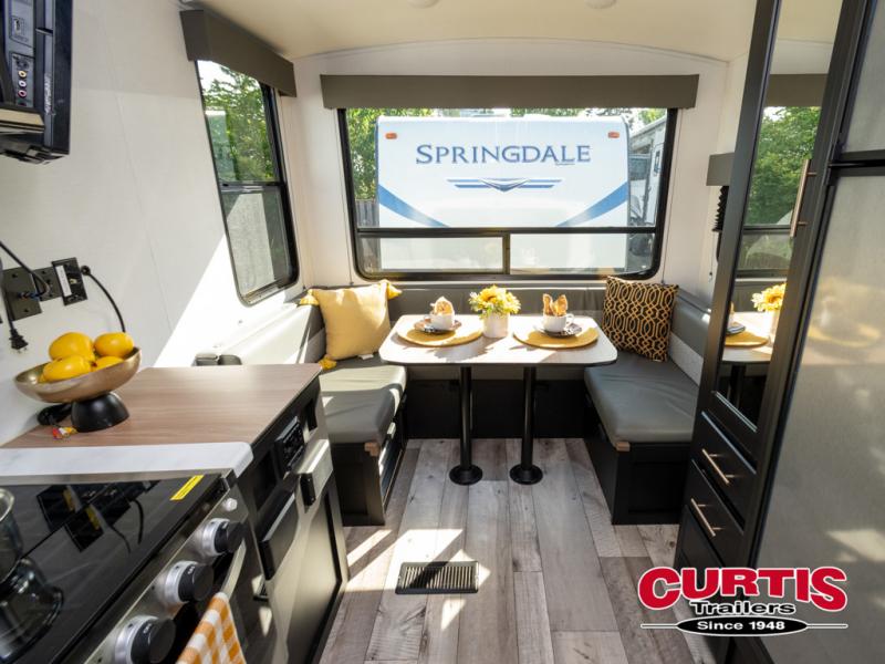 Take your camping up a notch with this Keystone Springdale. This trailer features a front semi-private bedroom with a comfy queen bed for a good night's rest and many conveniences that can make camping more enjoyable. The very rear of this trailer features a large U-shaped dinette for comfortable seating that you can enjoy dining at with a panoramic view. It can also be converted to additional sleeping if needed. There is a nearby entertainment center for your enjoyment, and a pantry is also included for snack, dry good and extra storage.