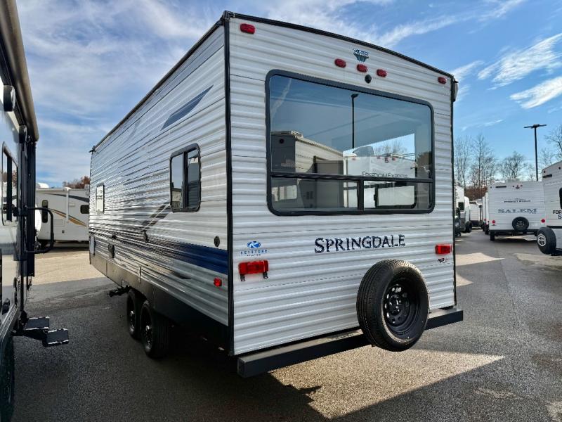 Getting away from work with your family and friends is easy to do with this Springdale travel trailer! You will have your own queen bed with dual closets and nightstands in the front bedroom, plus there is a divider to provide privacy when you need to change or have your own space away from the main area where the kiddos or your friends are sleeping on the furniture. When it's time for breakfast, you will find a full kitchen including a pantry, and a booth dinette to eat at or play games at when the weather isn't just right outside. And the full bathroom will keep everyone clean for whatever adventure is next!