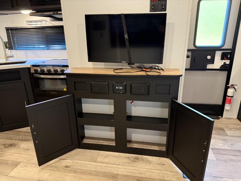 Comfort & Convenience Features: Powers include an awning with LED lighting, power stabilizer and tongue jacks, pass-through storage, and solar prep. Inside, there are features like in-floor ducting and unified wiring, plus Wi-Fi and 4G prep.
