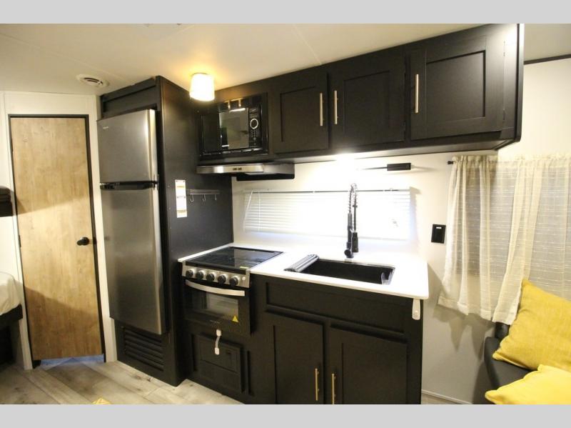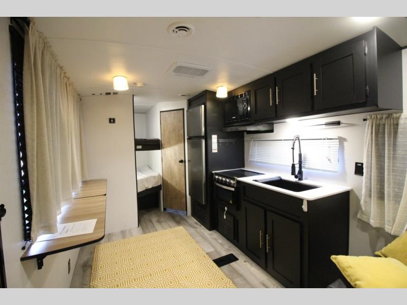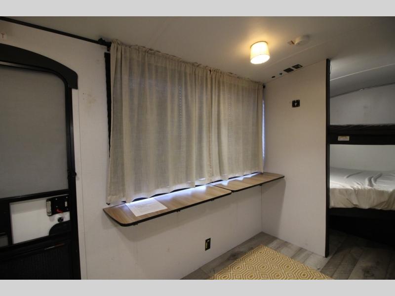 You are sure to love this Keystone Springdale travel trailer from the front private bedroom to the many different storage spaces for all of your camping needs! This trailer is fabulous for a larger group because it has a set of double-size bunks which will provide compact yet accommodating sleeping arrangements for your kids or friends. There is also a convenient full bathroom located next to the bunks which is super convenient, and allows everyone to get cleaned up before bedtime. You can enjoy your delicious meals at the booth dinette or even while relaxing on the sofa, and both of these can transform into extra sleeping spaces whenever needed.