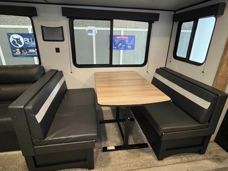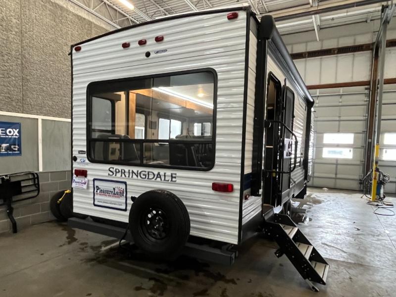 This rear living Springdale travel trailer features a large slide for added interior space, a booth dinette for meals, and two entry doors for convenience. The owners will have their own queen bed in the front private bedroom for a separate place to chill. The booth dinette and the sofa can both fold down into sleeping space after you have enjoy relaxing, dining and playing games. There is also plenty of storage space with overhead cabinetry, kitchen cupboards, and bedside closets, so you can bring whatever you need with you to make your next camping trip enjoyable!