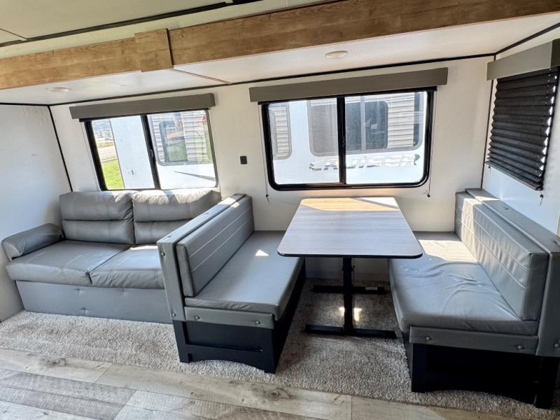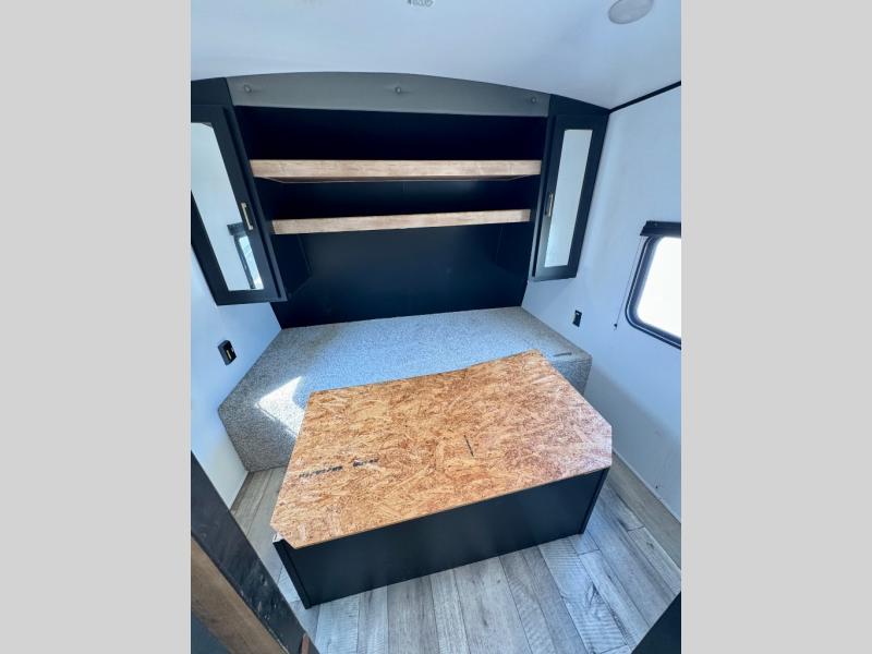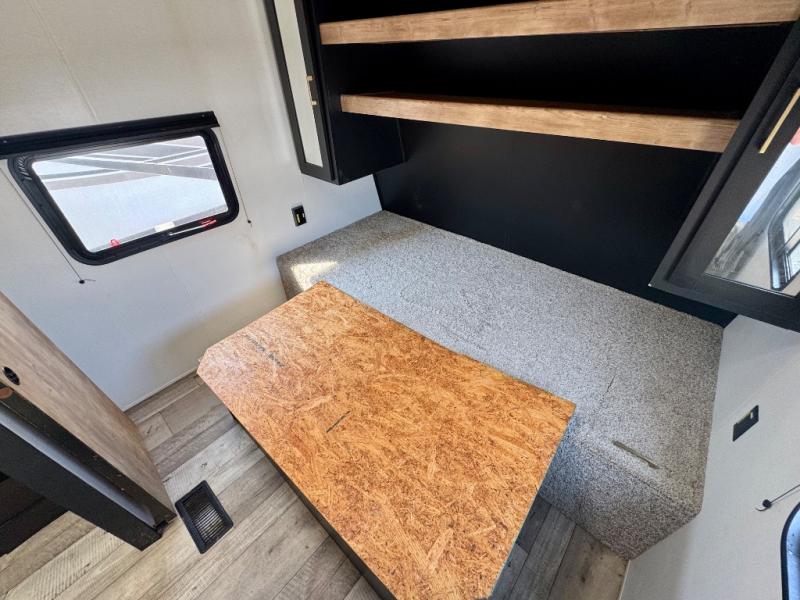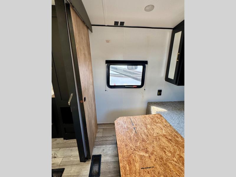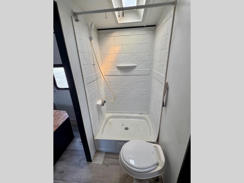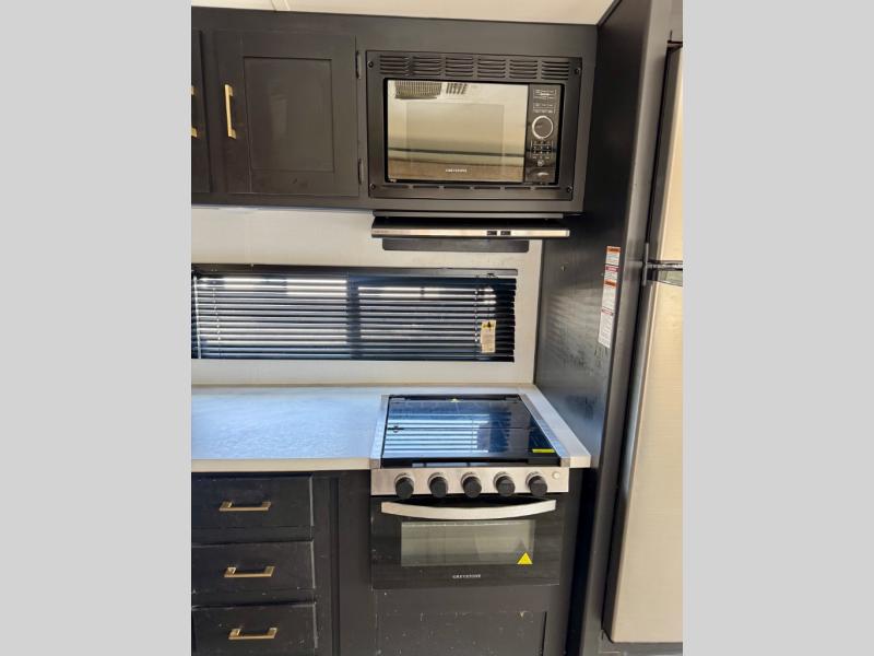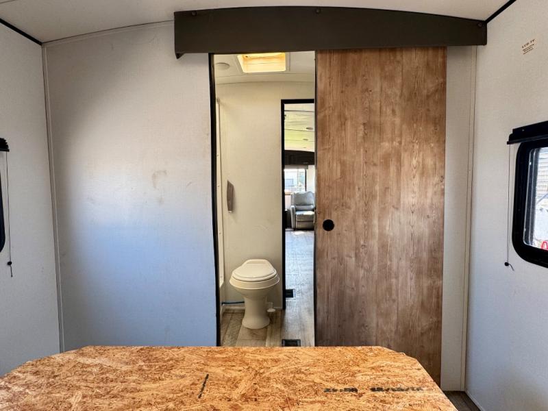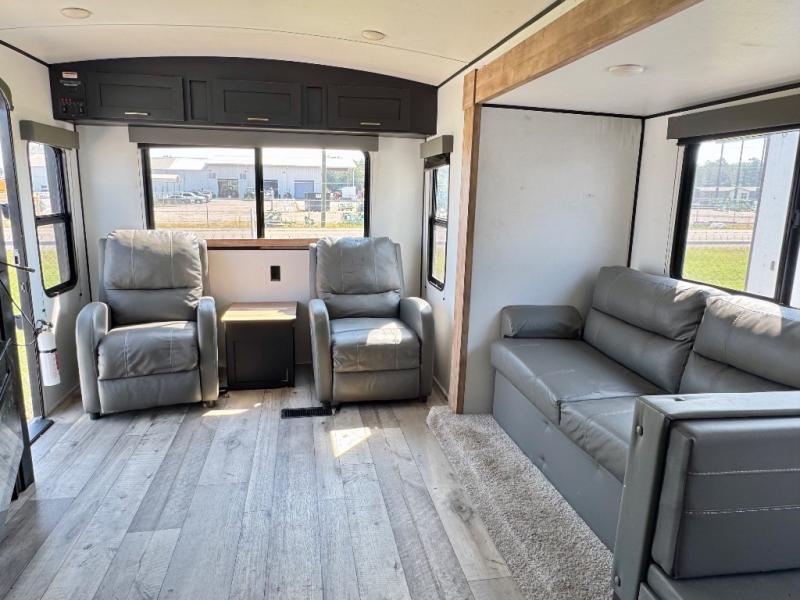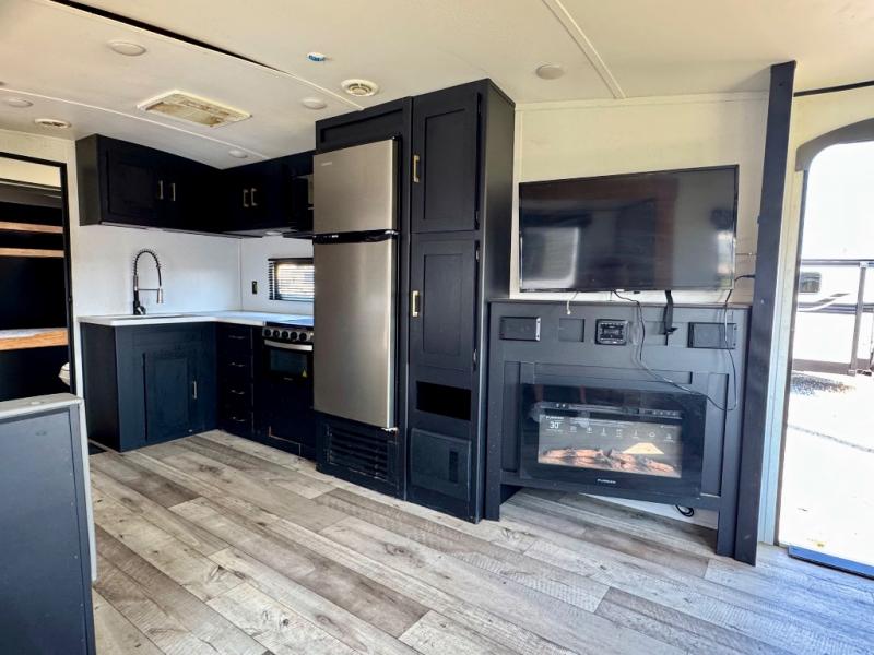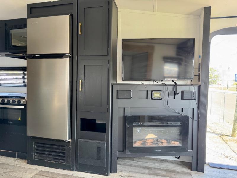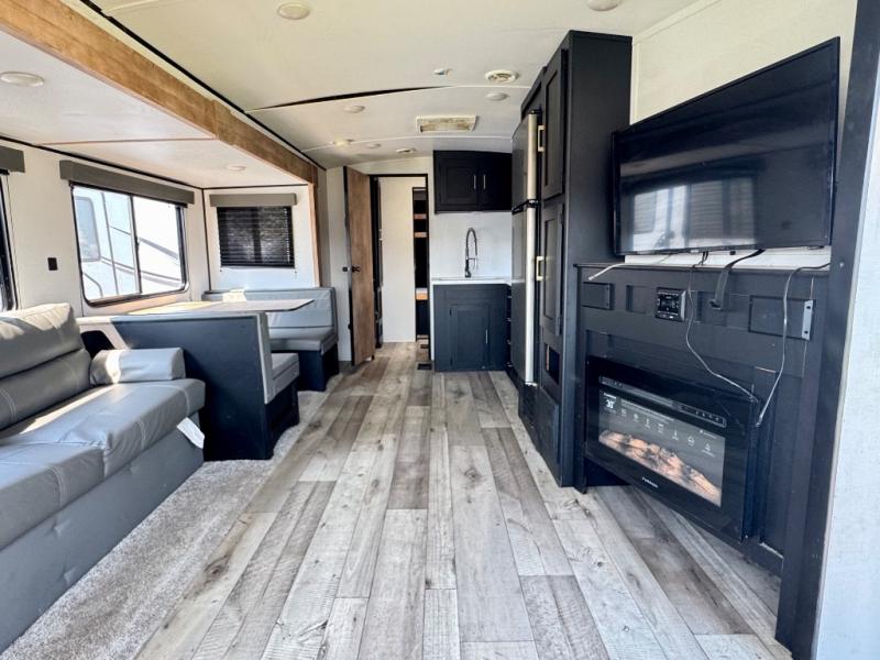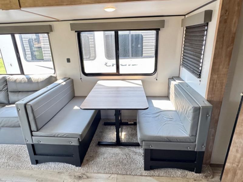 If you want a quick weekend trip or a longer week in the woods, this travel trailer is going to be your best choice because it has everything needed to enjoy your time away! There is a large slide in the main living area to provide you with some extra floor space to relax on the sofa, and the booth dinette will be a cozy spot to sit down with a hot meal. You can use the three-burner range to prepare that meal, the L-shaped counter to serve your meals from, and you can store some canned goods and snacks in the pantry. The fireplace makes this combined space cozy especially during those chilly camping evenings. And the 21' power awning is available for use whenever you want to relax outdoors, just grab your camping chairs from the front pass-through compartment.