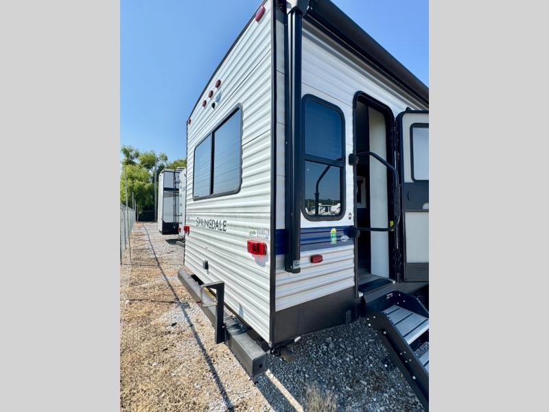 With any Keystone Springdale travel trailer, you will have a friction hinge entry door with sturdy LCI SolidStep steps, a pass-through storage compartment for your outdoor gear, and reliable Dexter E-Z Lube axles to maneuver your Springdale down the road and into the campsites. Some of the Keystone Exclusives provide 12V color-coded wiring with easy-to-trace circuits which is better than conventional RV wiring allowing a faster diagnosis for quicker repairs, and the streamlined heat distribution that uses in-floor heat vents for more efficiency for uninterrupted air flow. Also included, the Blade high performance air flow system that delivers 30% more air flow. The interior gives you pressed kitchen countertops, pleated night shades, and designer upholstered window valances for easy care and style, and more depending on the Springdale you choose!