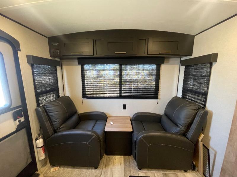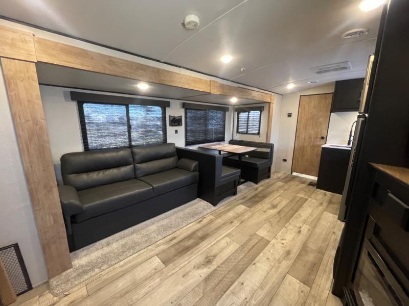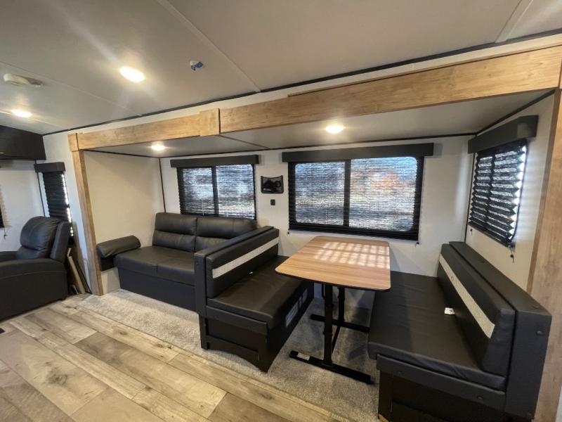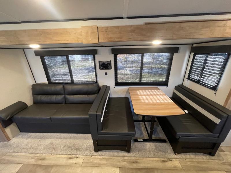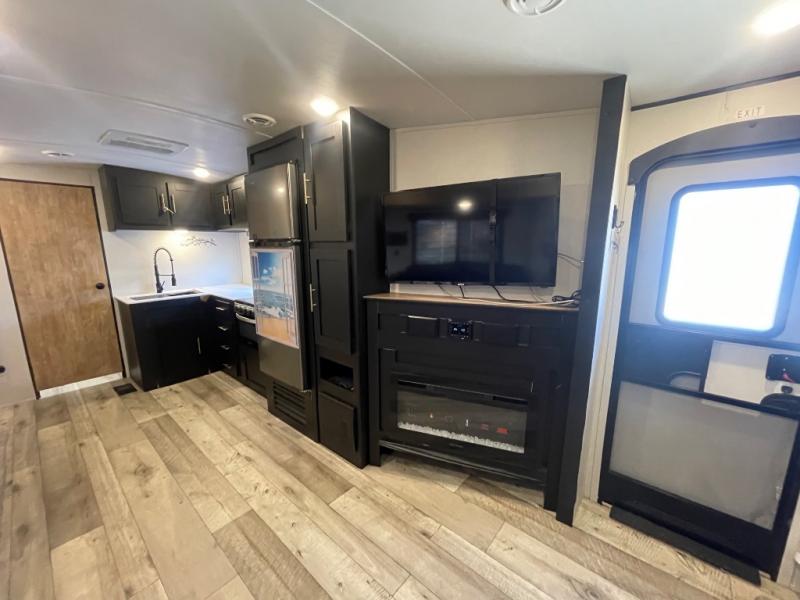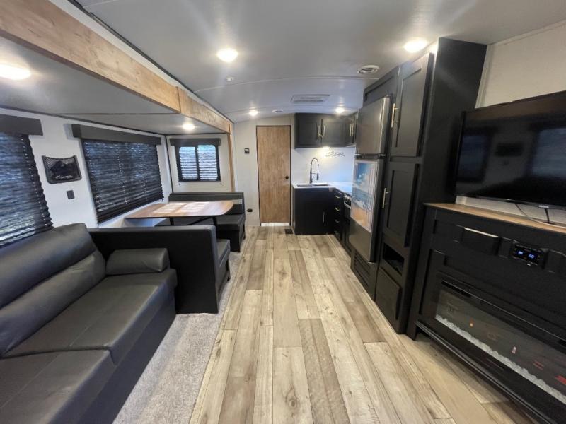 If you want a quick weekend trip or a longer week in the woods, this travel trailer is going to be your best choice because it has everything needed to enjoy your time away! There is a large slide in the main living area to provide you with some extra floor space to relax on the sofa, and the booth dinette will be a cozy spot to sit down with a hot meal. You can use the three-burner range to prepare that meal, the L-shaped counter to serve your meals from, and you can store some canned goods and snacks in the pantry. The fireplace makes this combined space cozy especially during those chilly camping evenings. And the 21' power awning is available for use whenever you want to relax outdoors, just grab your camping chairs from the front pass-through compartment.