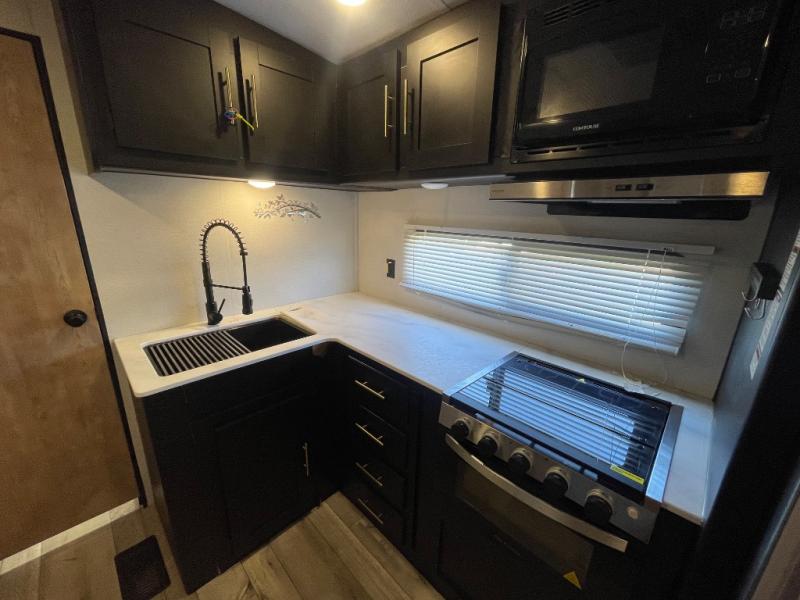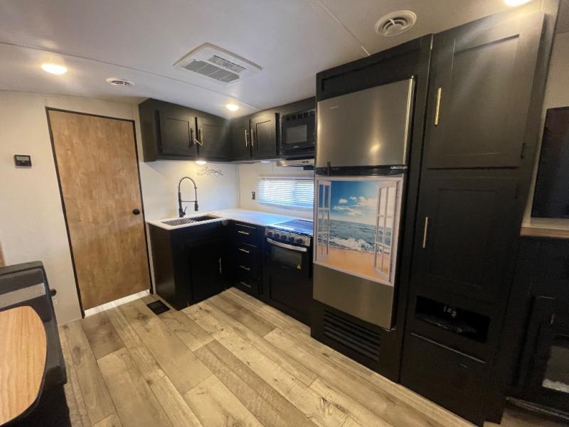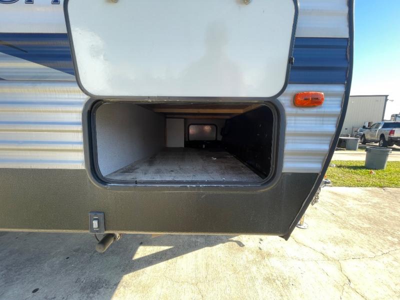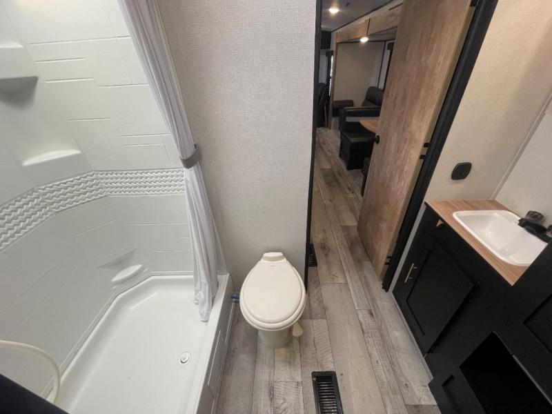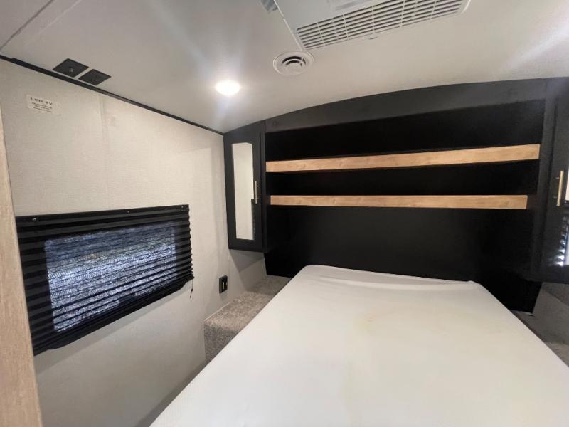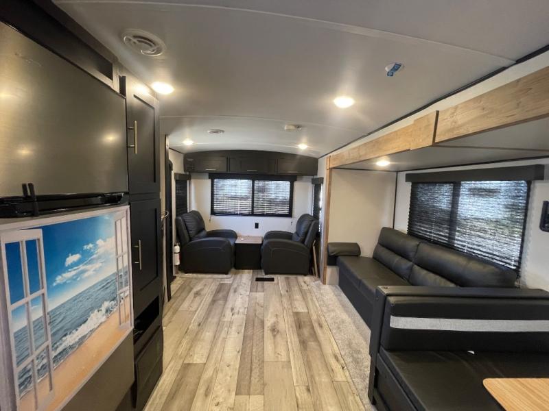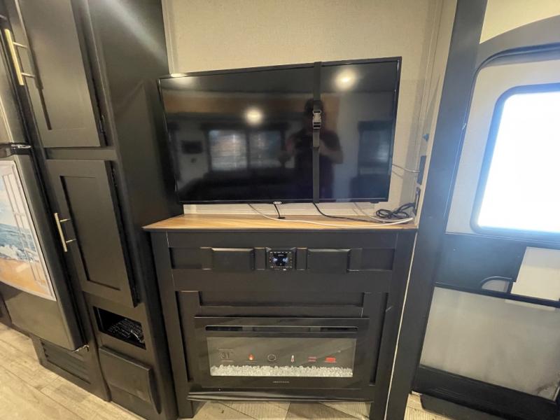 If you want a quick weekend trip or a longer week in the woods, this travel trailer is going to be your best choice because it has everything needed to enjoy your time away! There is a large slide in the main living area to provide you with some extra floor space to relax on the sofa, and the booth dinette will be a cozy spot to sit down with a hot meal. You can use the three-burner range to prepare that meal, the L-shaped counter to serve your meals from, and you can store some canned goods and snacks in the pantry. The fireplace makes this combined space cozy especially during those chilly camping evenings. And the 21' power awning is available for use whenever you want to relax outdoors, just grab your camping chairs from the front pass-through compartment.