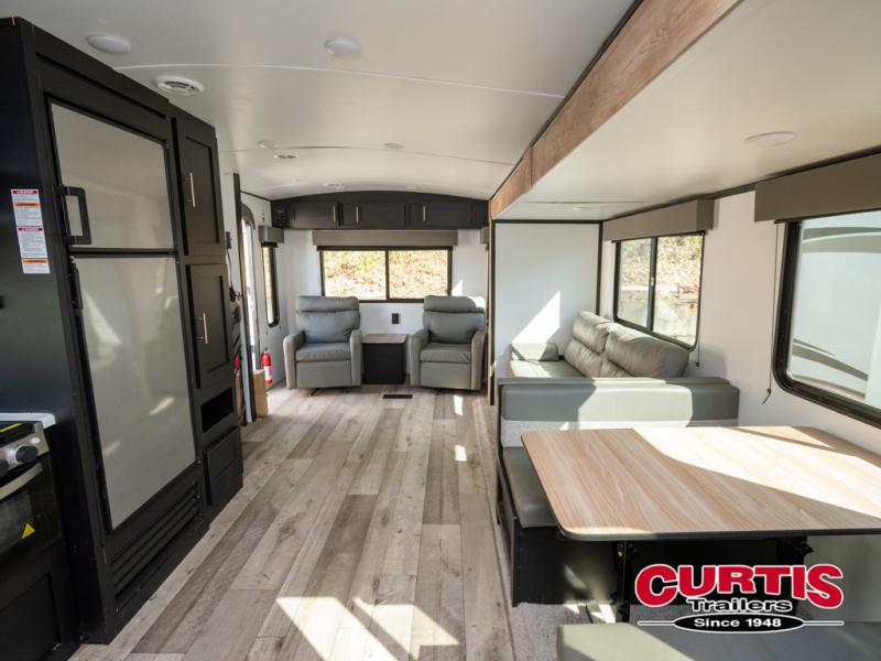 If you want a quick weekend trip or a longer week in the woods, this travel trailer is going to be your best choice because it has everything needed to enjoy your time away! There is a large slide in the main living area to provide you with some extra floor space to relax on the sofa, and the booth dinette will be a cozy spot to sit down with a hot meal. You can use the three-burner range to prepare that meal, the L-shaped counter to serve your meals from, and you can store some canned goods and snacks in the pantry. The fireplace makes this combined space cozy especially during those chilly camping evenings. And the 21' power awning is available for use whenever you want to relax outdoors, just grab your camping chairs from the front pass-through compartment.