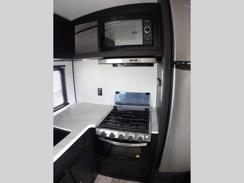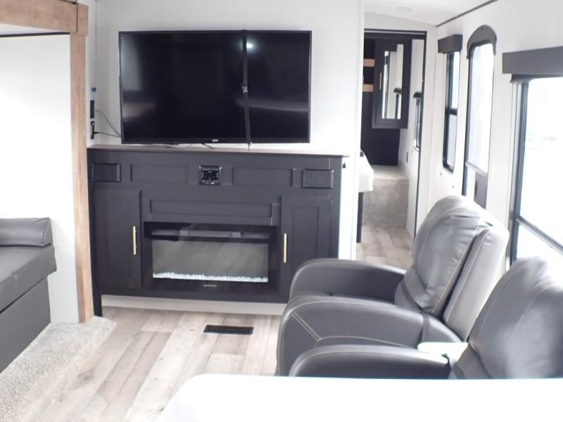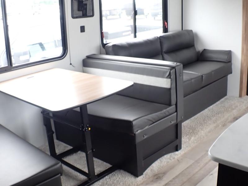 The rear kitchen in this Springdale travel trailer is great because of the U-shaped countertop which gives you plenty of room for prepping your meals and cleaning up as well as all the appliances and the pantry. There are a few seating choices throughout where you can relax, play games, or eat meals, like the two recliners with a table in between to place your drinks and keys, the sofa, and the booth dinette. The private master bedroom up front has a queen bed which is perfect for a good night's rest, and storage on each side plus above the head of the bed.