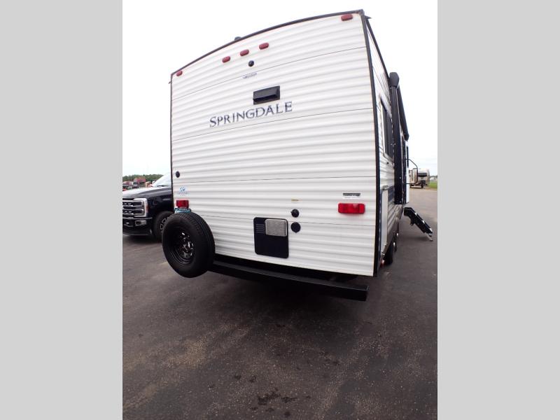 With any Keystone Springdale travel trailer, you will have a friction hinge entry door with sturdy LCI SolidStep steps, a pass-through storage compartment for your outdoor gear, and reliable Dexter E-Z Lube axles to maneuver your Springdale down the road and into the campsites. Some of the Keystone Exclusives provide 12V color-coded wiring with easy-to-trace circuits which is better than conventional RV wiring allowing a faster diagnosis for quicker repairs, and the streamlined heat distribution that uses in-floor heat vents for more efficiency for uninterrupted air flow. Also included, the Blade high performance air flow system that delivers 30% more air flow. The interior gives you pressed kitchen countertops, pleated night shades, and designer upholstered window valances for easy care and style, and more depending on the Springdale you choose!