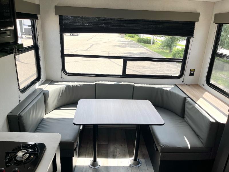 You will find lots of storage inside and outside this trailer allowing you to bring along everything you need for a great camping trip! Along the exterior there are two pass-through compartments for your outdoor gear and a 10' power awning giving you a covered outdoor living area to enjoy when you aren't inside. The cook will have a two burner cooktop to make meals, and the U-shaped dinette offers great views out of the panoramic windows. There is a full bathroom to get cleaned up in before bedtime, and a queen bed to fall asleep quickly so you can have fun again tomorrow.