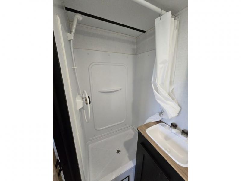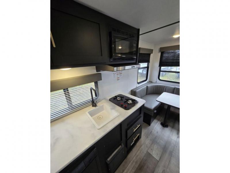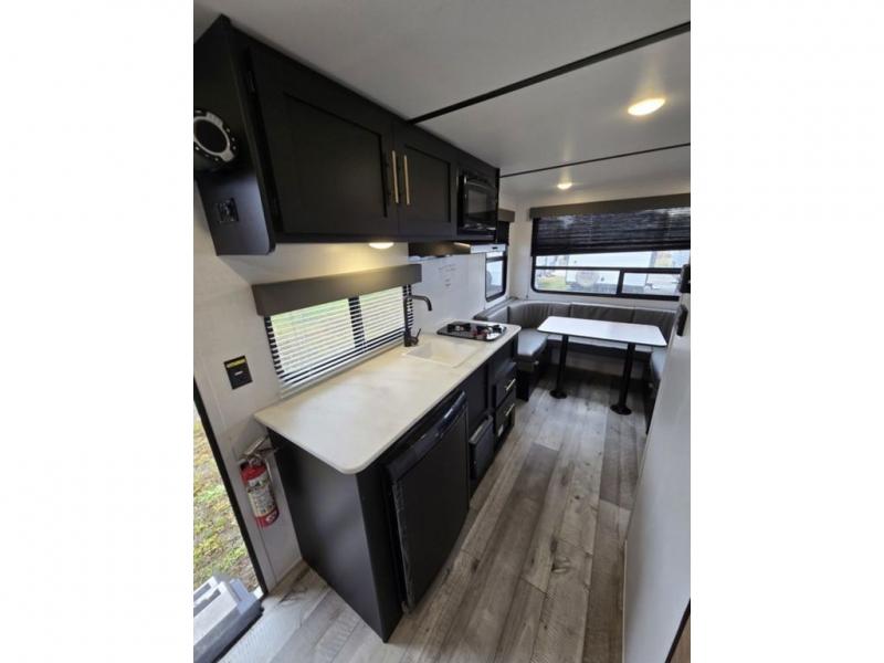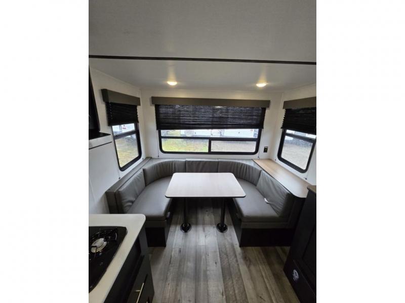 You will find lots of storage inside and outside this trailer allowing you to bring along everything you need for a great camping trip! Along the exterior there are two pass-through compartments for your outdoor gear and a 10' power awning giving you a covered outdoor living area to enjoy when you aren't inside. The cook will have a two burner cooktop to make meals, and the U-shaped dinette offers great views out of the panoramic windows. There is a full bathroom to get cleaned up in before bedtime, and a queen bed to fall asleep quickly so you can have fun again tomorrow.