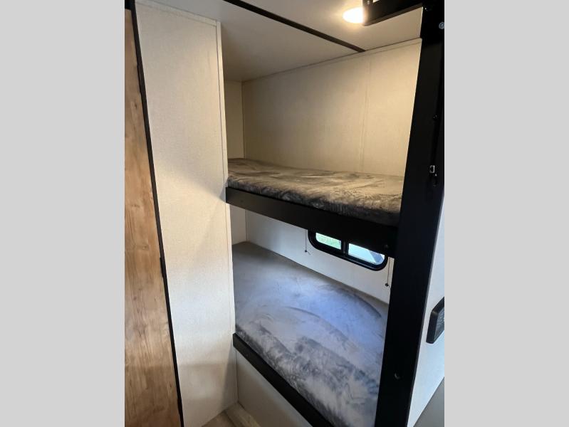 Get ready for outdoor fun with your favorite people when you have this trailer in tow! Once at your campsite, you can easily setup the 10' power awning, grab your camping chairs from the pass-through storage, and relax or start playing. The cook will love the galley kitchen with the two burner cooktop, plus the pantry and 3 cu. ft. refrigerator to stow away all the food. If you like, you can eat inside at the booth dinette which doubles as sleeping space, and of course the kids will love the bunk beds next to the full bathroom. And you will sleep like a queen up front.