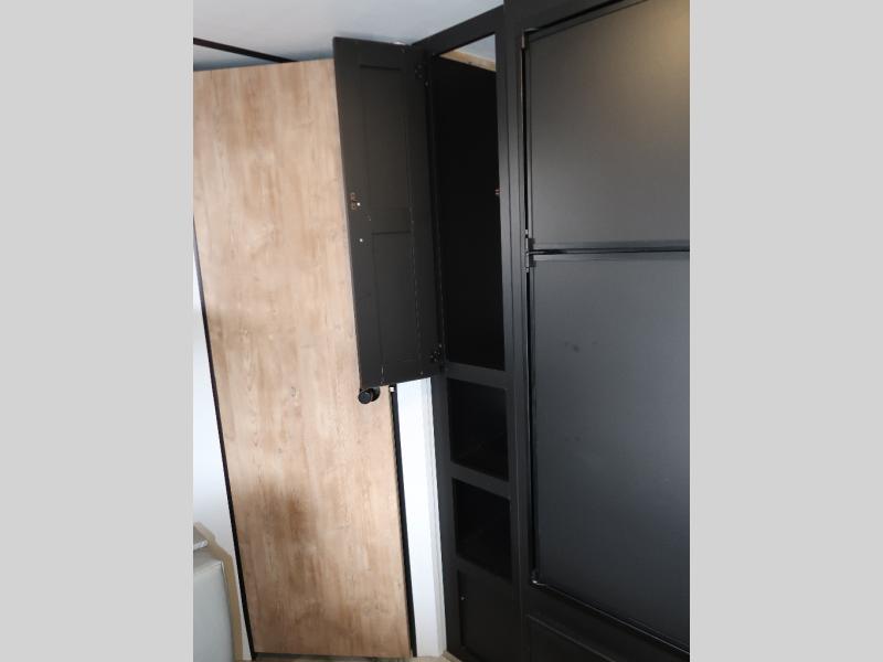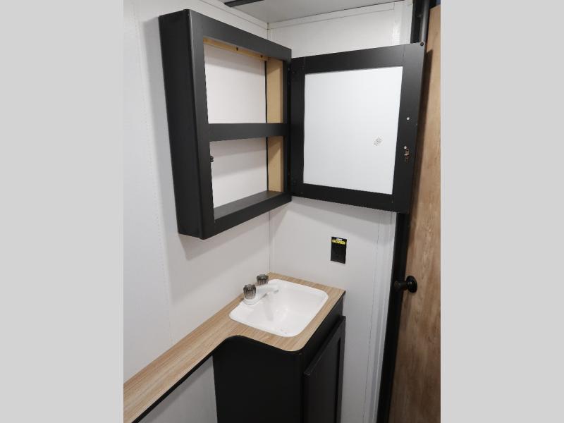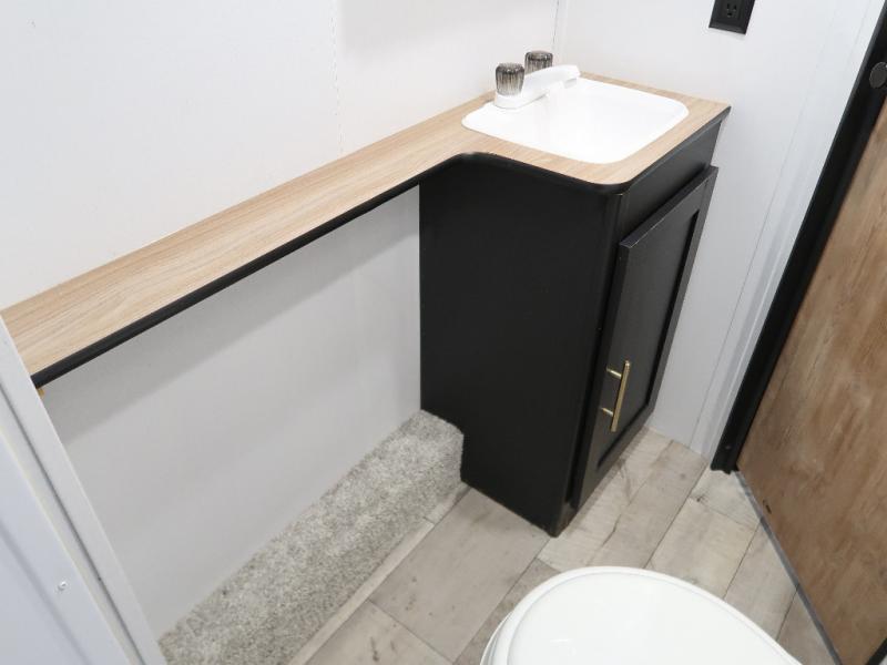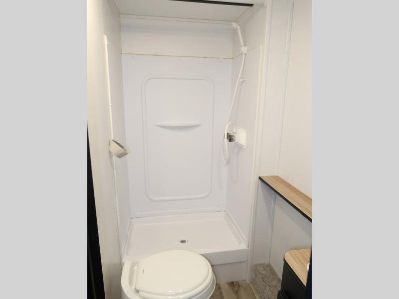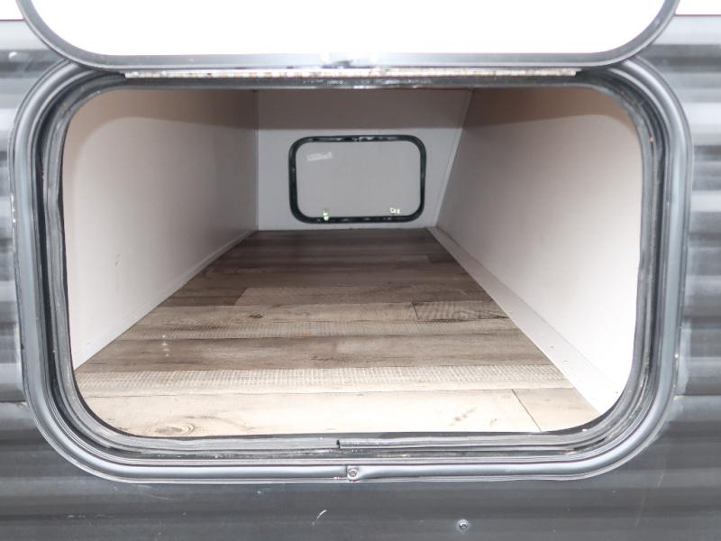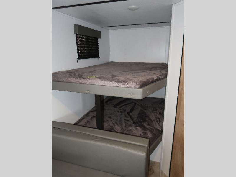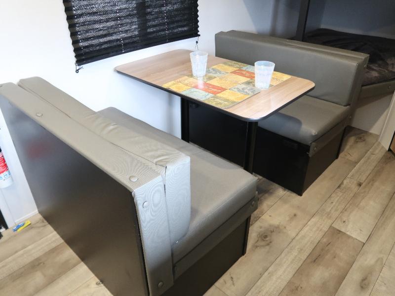 This double axle trailer offers lots of sleeping space for your family and friends with the double-size bunk beds, the queen bed and the booth dinette. Once everyone selects their sleeping space, you can take turns getting cleaned up in the full bathroom with extra counter space for everyone's toiletries. The cook can whip up a snack before bedtime on the two burner cooktop or grab something from the 6 cu. ft. refrigerator and the pantry. There is a closet up front, overhead storage throughout, and inside storage under the bunk for everyone's things. And the exterior provides a pass-through compartment for more items and the outdoor gear like fishing poles and camping chairs.