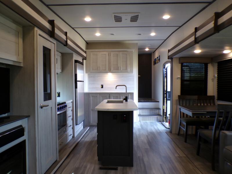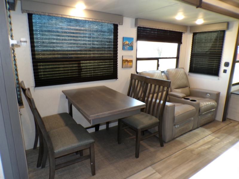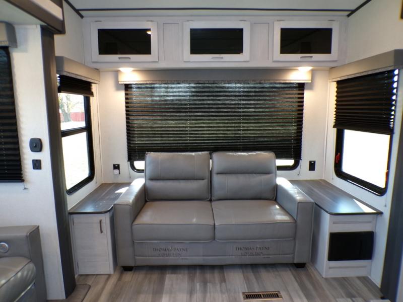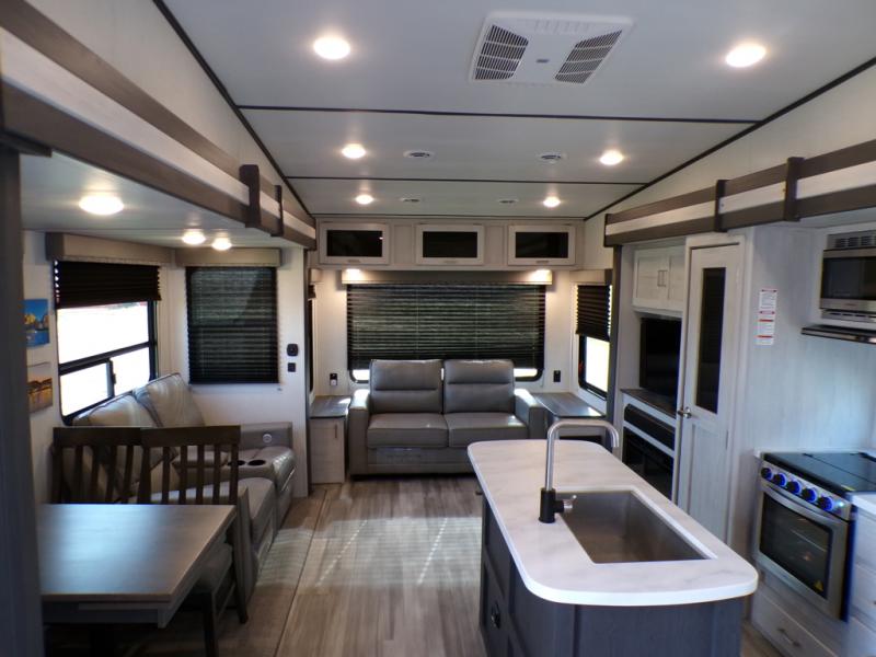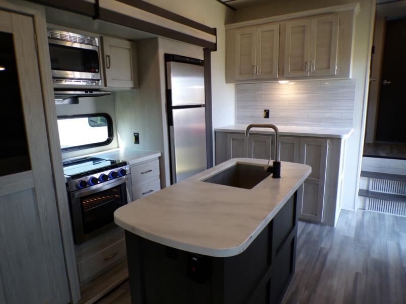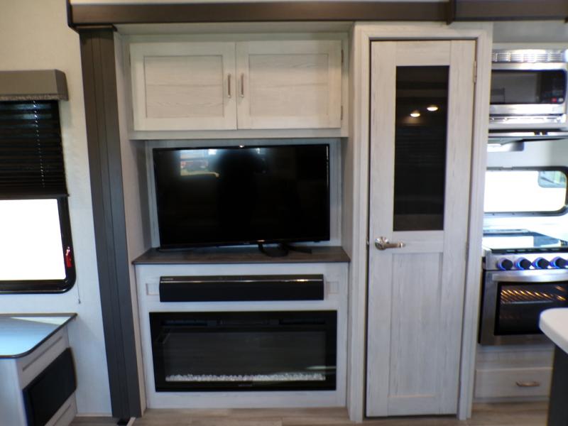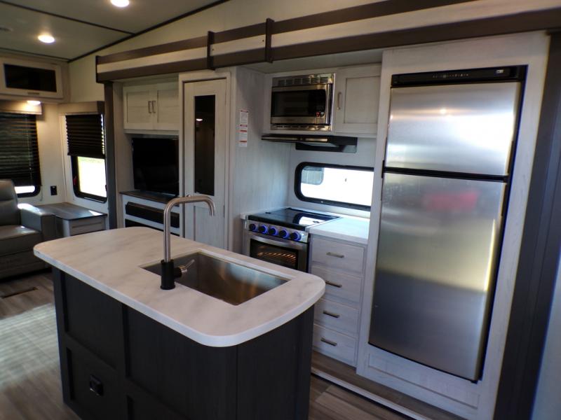 This fifth wheel will be calling your name after a long hike to enjoy the queen-size tri-fold sofa, the full reclining theatre seats with massage, lights and USB charging, and the 40" LED HD TV with fireplace/heater below. When you are rested, you can prepare and cook meals in the full kitchen with a three-burner gas range with a 21" stainless steel oven, a glass top and piezo electronic ignite, plus a stainless steel microwave with carousel, and an 8 cu. ft. refrigerator. The kitchen island and extra prep area will come in handy when making those holiday meals. The front private bedroom offers a residential queen bed, a slide out wardrobe, two nightstands and outlets to keep everything charged. And the double entry bathroom will come in handy, plus the residential shower with a seat will be relaxing. There are many more features including along the exterior such as the central hookup station with hot and cold water hookup, the ladder for roof access, the LP quick connect, the outdoor TV prep and more!