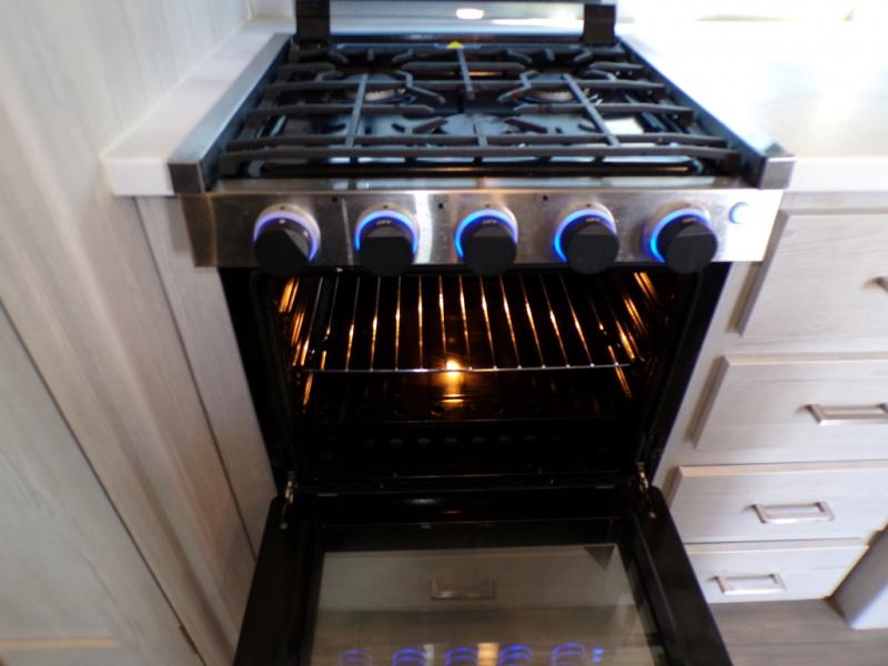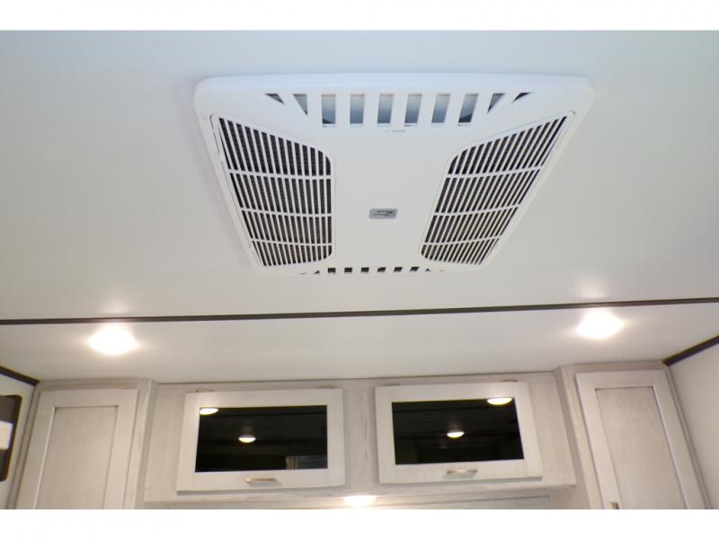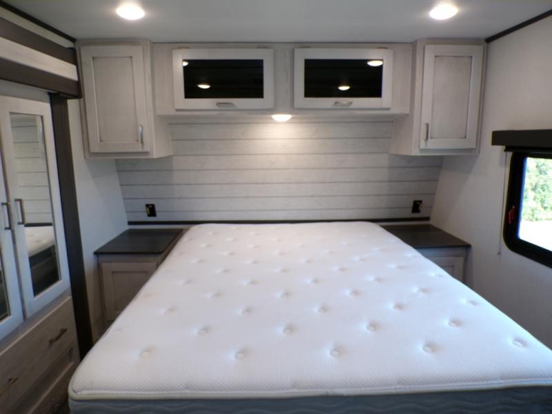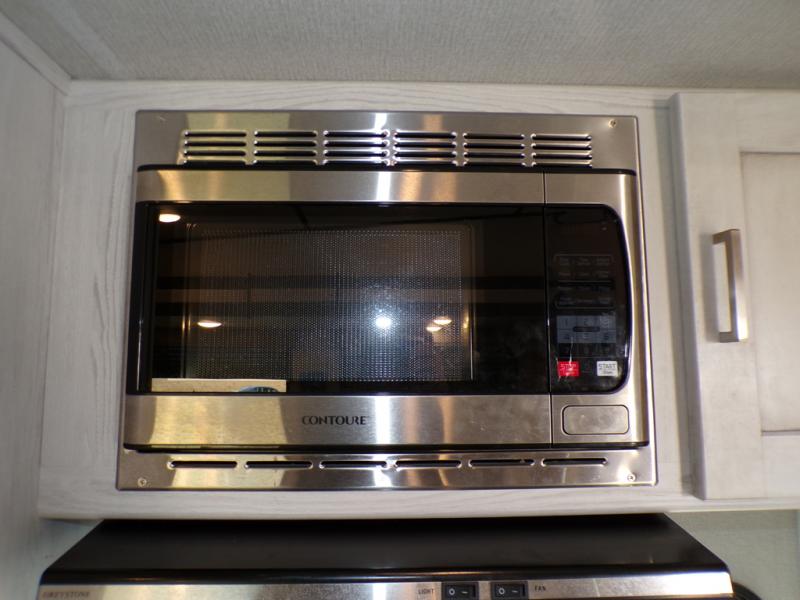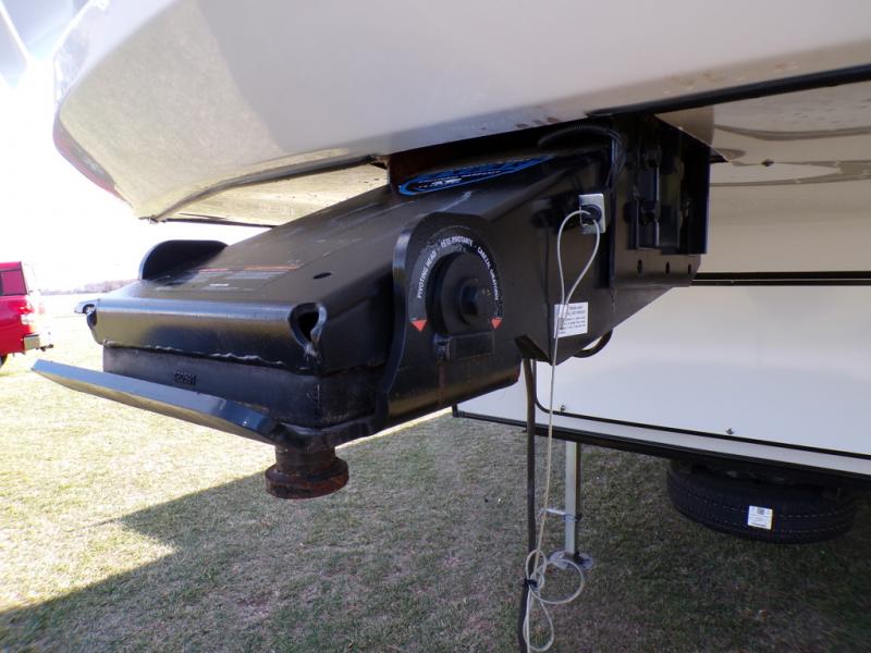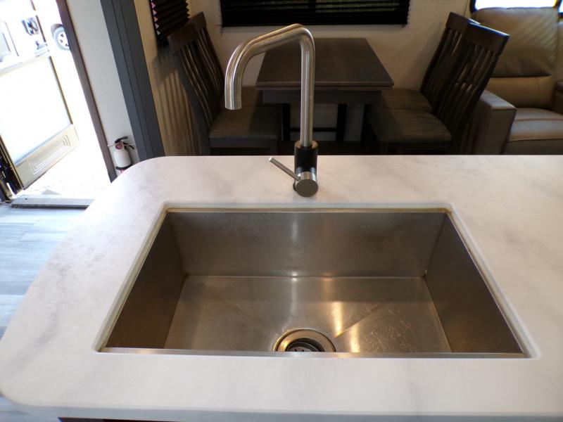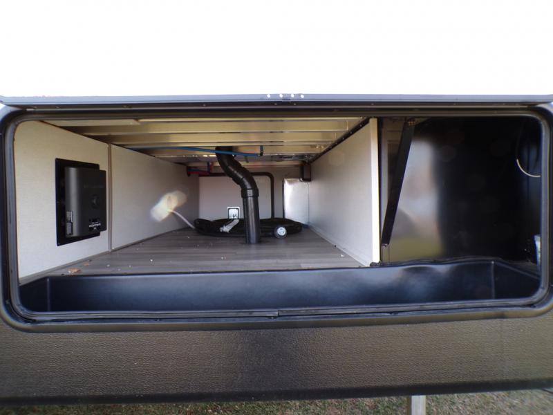 This fifth wheel will be calling your name after a long hike to enjoy the queen-size tri-fold sofa, the full reclining theatre seats with massage, lights and USB charging, and the 40" LED HD TV with fireplace/heater below. When you are rested, you can prepare and cook meals in the full kitchen with a three-burner gas range with a 21" stainless steel oven, a glass top and piezo electronic ignite, plus a stainless steel microwave with carousel, and an 8 cu. ft. refrigerator. The kitchen island and extra prep area will come in handy when making those holiday meals. The front private bedroom offers a residential queen bed, a slide out wardrobe, two nightstands and outlets to keep everything charged. And the double entry bathroom will come in handy, plus the residential shower with a seat will be relaxing. There are many more features including along the exterior such as the central hookup station with hot and cold water hookup, the ladder for roof access, the LP quick connect, the outdoor TV prep and more!