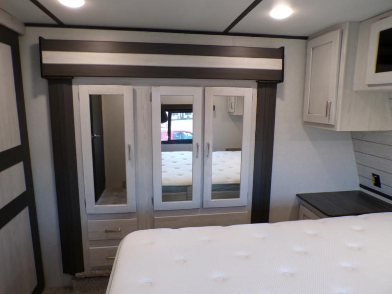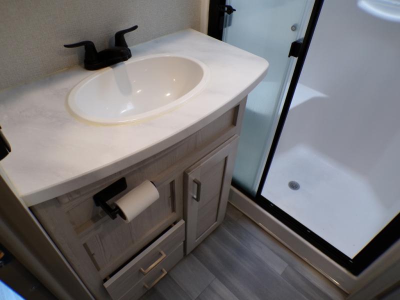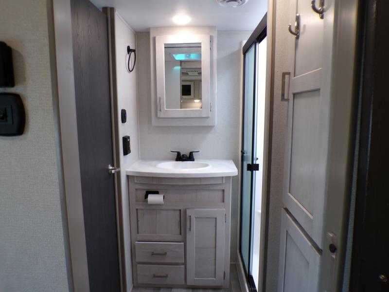 With any Sprinter fifth wheel by Keystone RV, you will have elements of a traditional RV lifestyle, Camping Made Easy features, and more living space, storage and towing stability in this longest-standing brand! The exterior includes a 100" wide-body frame with full width outriggers, MaxTurn technology with Road Armor suspension, Hitch Vision, an automotive-grade painted fiberglass front cap with KeyShield protection, plus the Thermal package and a heated and enclosed underbelly with astro-foil insulation for all-weather camping. There is a wireless remote control for slideouts, lights, awning and more, Thomas Payne theatre seating with USB, lights and massage, plus woven flooring that is highly durable marine-grade flooring for easy cleanup after a fun trip. Make your selection today!