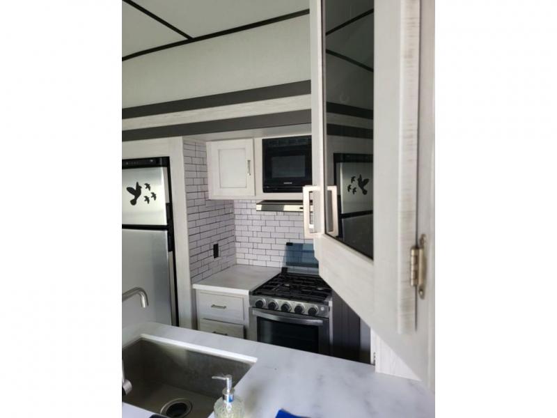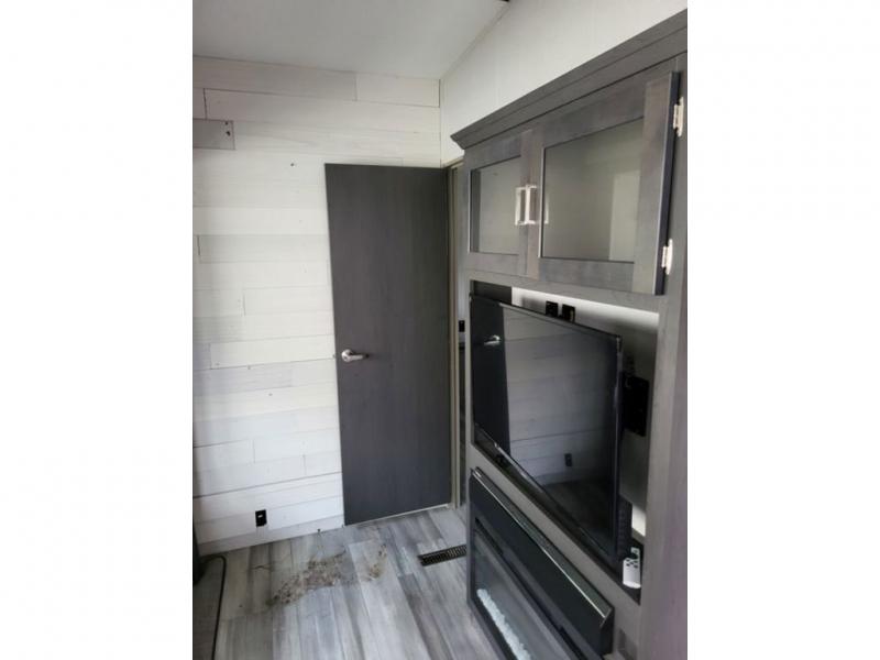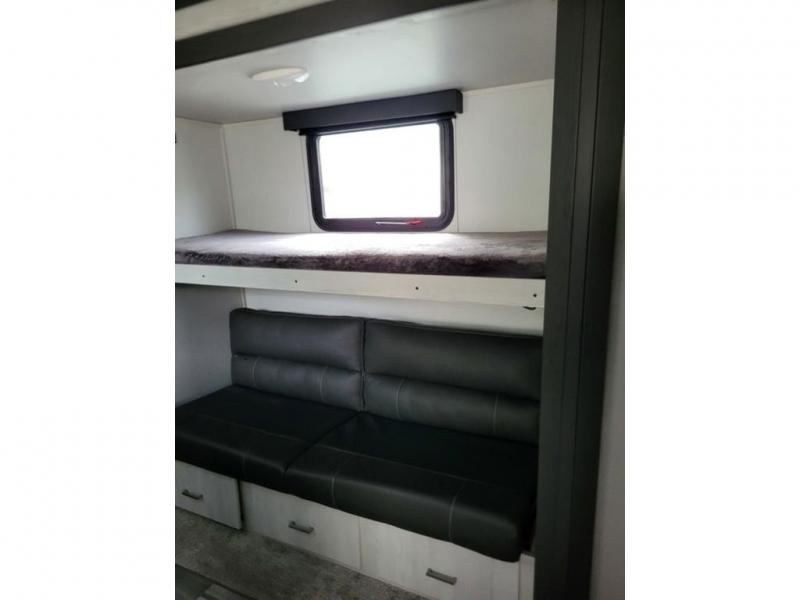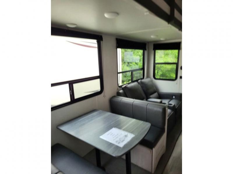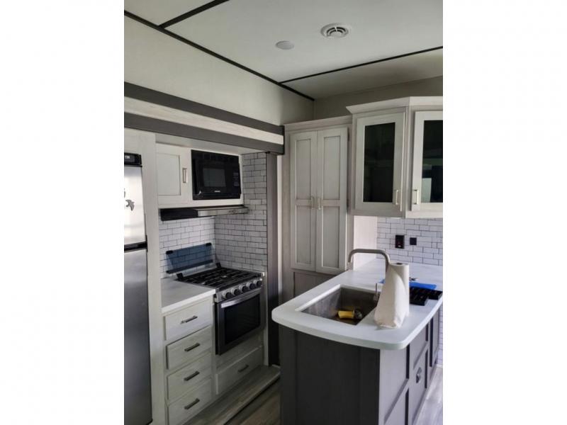 Explore new scenery with this fifth wheel at every campsite you have been wanting to visit! You can hike, fish or whatever you enjoy doing outdoors, and then relax and unwind inside with features that make you feel right at home. Beginning with the kids or your guests having their own privacy in the bunkhouse suite which includes a half bath, a slide out sleeper sofa with storage and a bunk above plus a second bunk. You will have a residential queen bed to sleep on in the front bedroom which also has two nightstands and outlets to keep your electronics charged, plus access to the full bathroom with a space savings radius shower. The kitchen and living area are spacious as well with two slides which include the three-burner gas range with glass top and 21" stainless steel oven, extra prep area, and a peninsula countertop with a single-basin stainless steel industrial sink to keep everything clean, plus the full reclining theatre seats with massage, lights and USB, and the booth dinette or choose the free standing option. And the exterior offers the cook an outdoor kitchen with a premium convenience center, plus you will enjoy the protection from the 15' electric awning, and the many more features inside and outside for convenience and comfort!