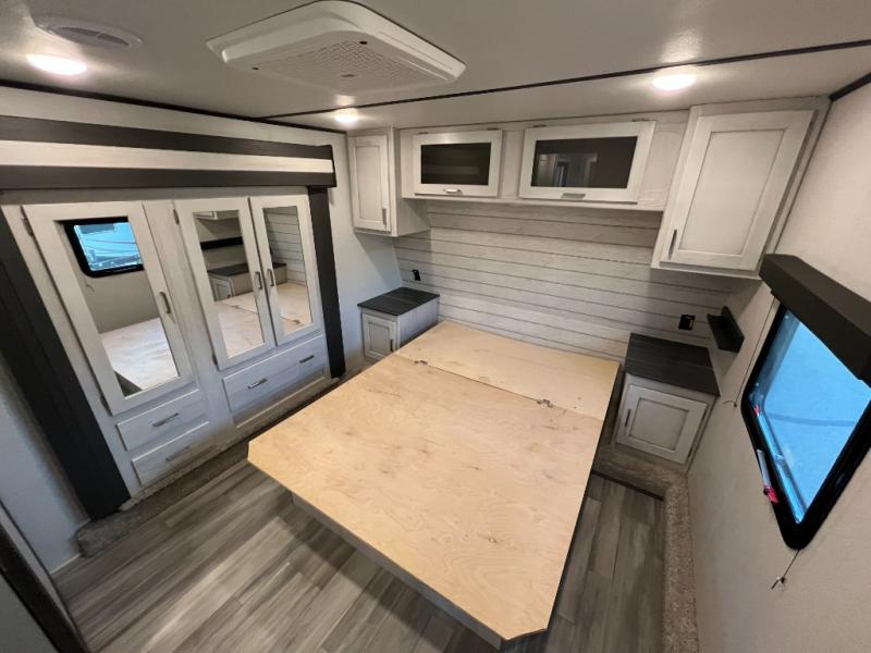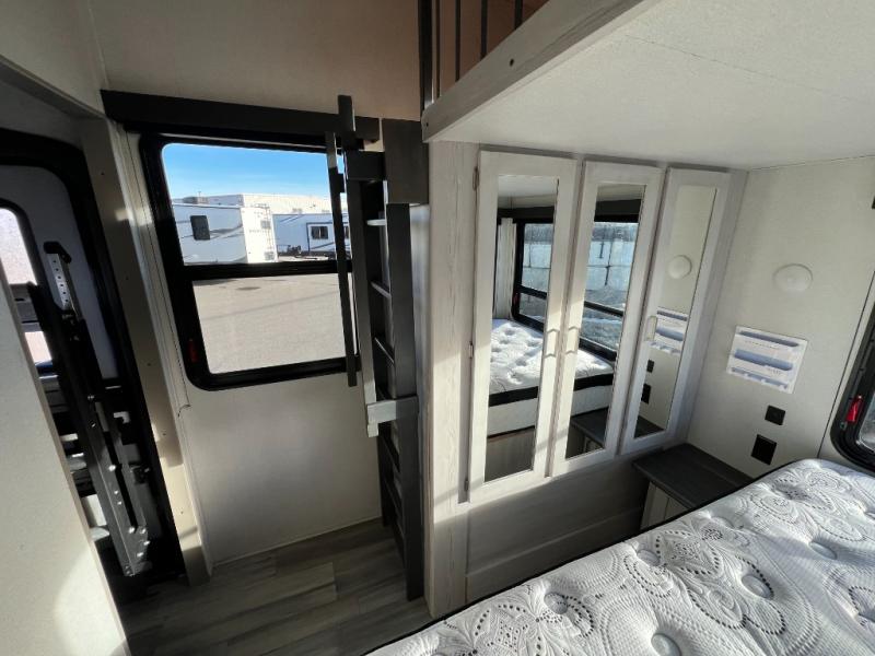 With any Sprinter fifth wheel by Keystone RV, you will have elements of a traditional RV lifestyle, Camping Made Easy features, and more living space, storage and towing stability in this longest-standing brand! The exterior includes a 100" wide-body frame with full width outriggers, MaxTurn technology with Road Armor suspension, Hitch Vision, an automotive-grade painted fiberglass front cap with KeyShield protection, plus the Thermal package and a heated and enclosed underbelly with astro-foil insulation for all-weather camping. There is a wireless remote control for slideouts, lights, awning and more, Thomas Payne theatre seating with USB, lights and massage, plus woven flooring that is highly durable marine-grade flooring for easy cleanup after a fun trip. Make your selection today!