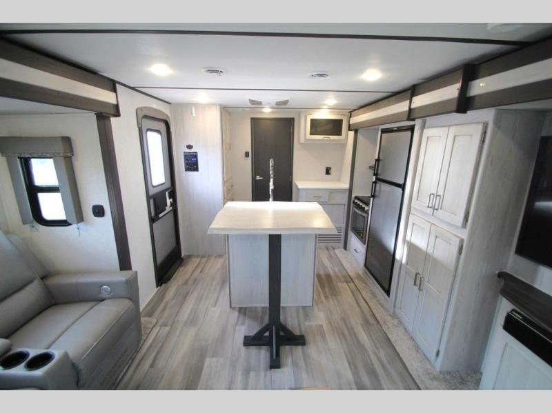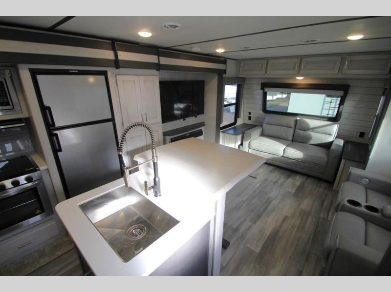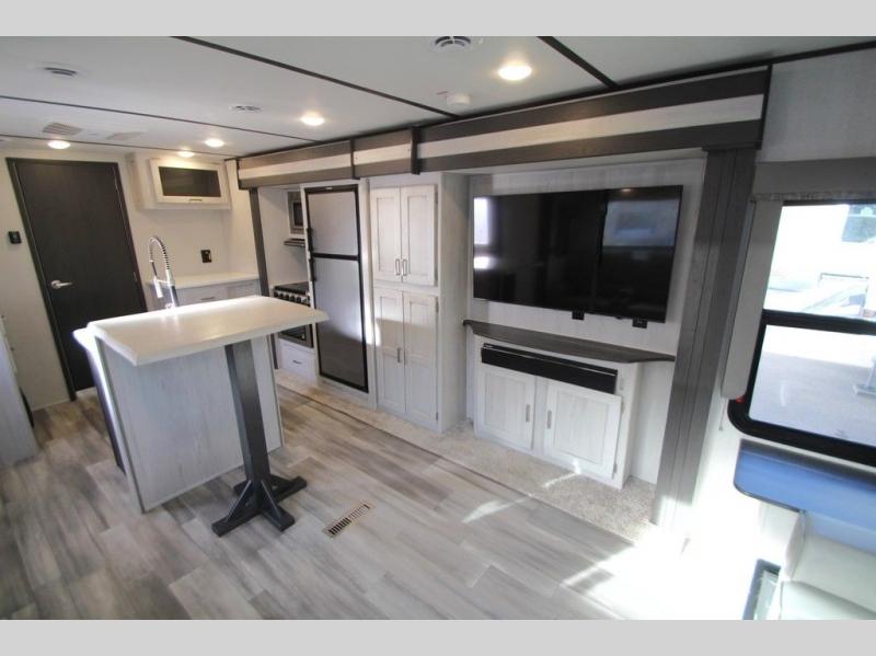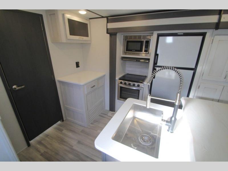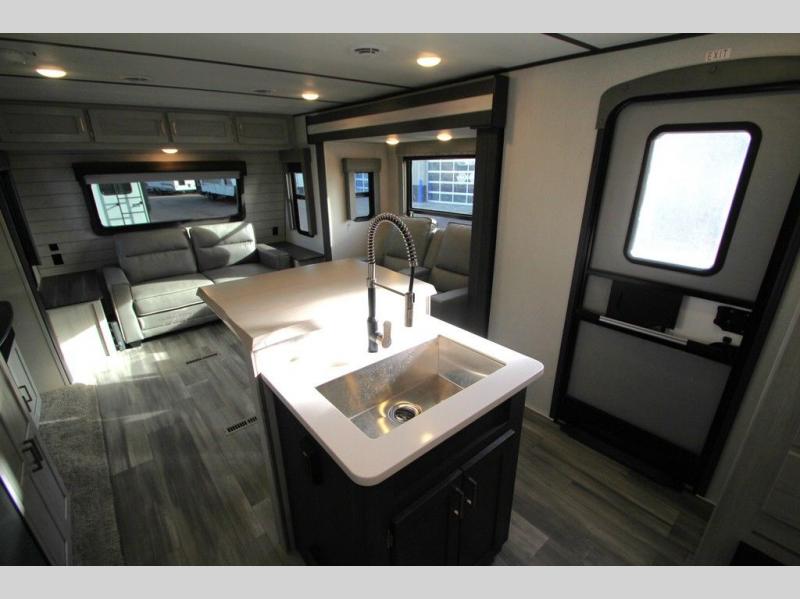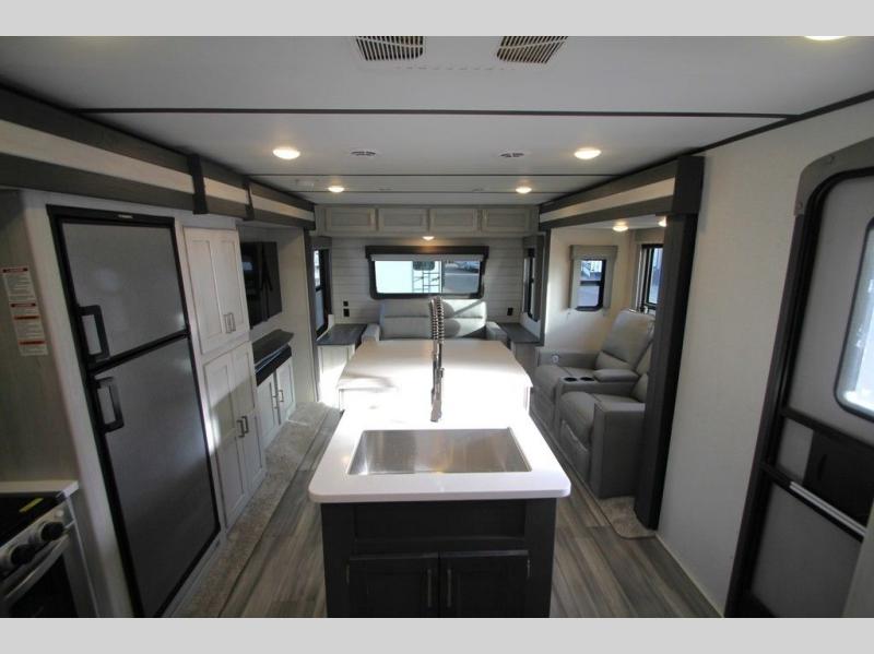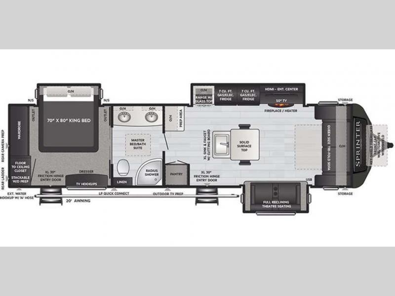 This Sprinter Limited travel trailer has a great kitchen that offers you a solid-surface island top with seating on either side. The kitchen also has a prep area, a range with glass top, two pantries, and an 8-cubic foot refrigerator. The kitchen is incorporated into the main living area, so you can all be together when dinner is being prepared. You can lounge on the queen-size tri-fold sofa or the full-reclining theater seating with massage, lights, and USB. You'll stay warm with the fireplace, and the 50" LED HDTV will provide entertainment when you're ready to watch a movie. The walk-through bathroom connects the main living area to the rear bedroom, and it offers you a dual-sink vanity to help you stay out of your spouse's way as you both get ready in the morning.
