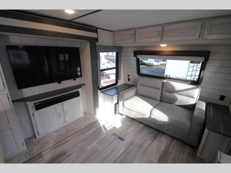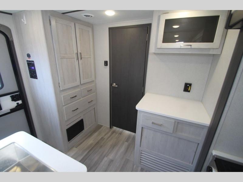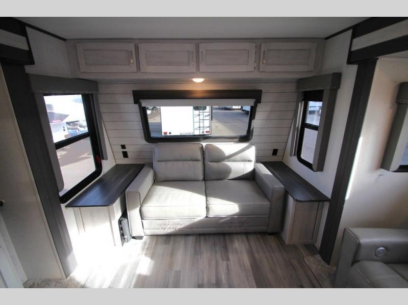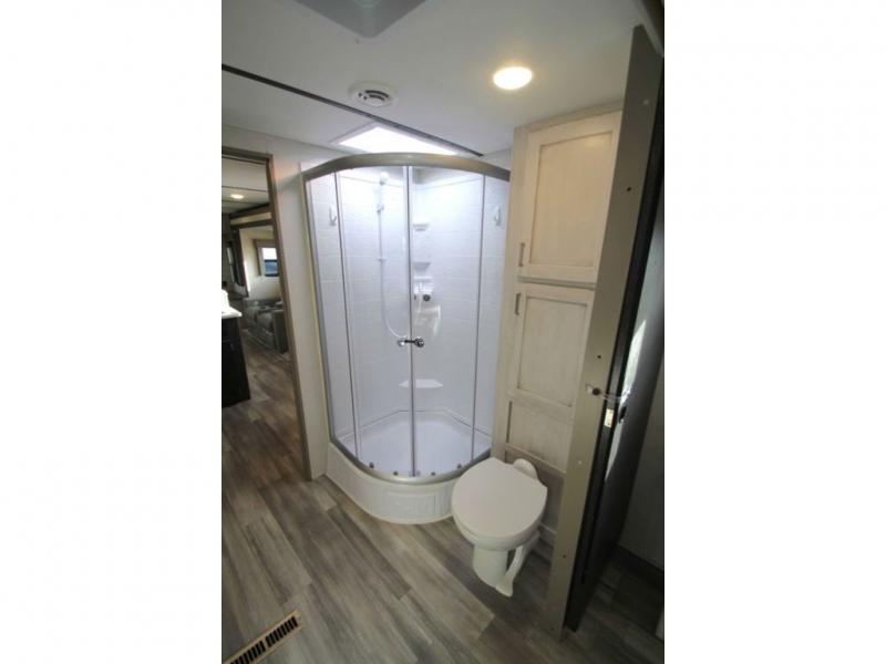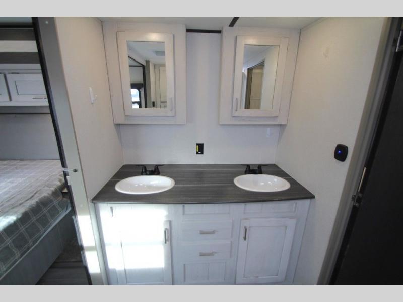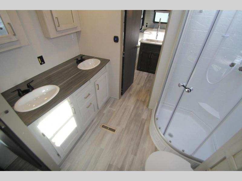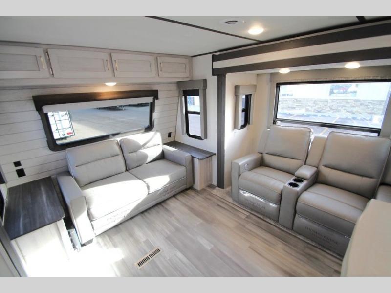 This Sprinter Limited travel trailer has a great kitchen that offers you a solid-surface island top with seating on either side. The kitchen also has a prep area, a range with glass top, two pantries, and an 8-cubic foot refrigerator. The kitchen is incorporated into the main living area, so you can all be together when dinner is being prepared. You can lounge on the queen-size tri-fold sofa or the full-reclining theater seating with massage, lights, and USB. You'll stay warm with the fireplace, and the 50" LED HDTV will provide entertainment when you're ready to watch a movie. The walk-through bathroom connects the main living area to the rear bedroom, and it offers you a dual-sink vanity to help you stay out of your spouse's way as you both get ready in the morning.