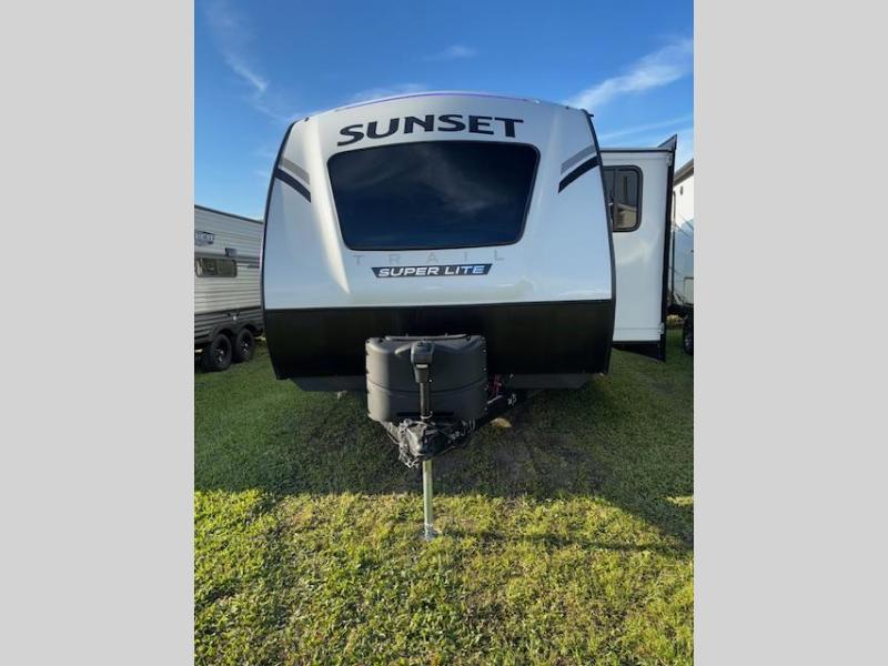 You will love this RV. It has everything you need and then some. The Sunset trail is 30' 11" long with two slides and weighs 5980 lbs. Sleeps 4 to 6 depending on size. Two large solar panels on the roof power a inverter that will give you some a/c power when you are dry camping. You will have everything but air conditioning and microwave. It has a full kitchen up front with plenty of counter space, large frig and freezer. 3 burner stove, large sink, and microwave. There are plenty cabinets, drawers, and outlets for appliances. Eat your meals at your bench seat dinette that can go down to a bed. Next to the dinette is a couch that can make a bed. Across from the couch is a 32" TV with AM, FM radio. Going toward the back is a full bathroom with a large shower, toilet, vanity with sink and medicine chest, and linen closet. Best of all is the rear bedroom with a slide. You have a King size Walk around bed with two huge hanging cloths closets and drawers for storage. Outside You have a electric awning with LED Lights, outside storage, and electric tongue jack. There are two Large Solar Panels on the roof that go to a inverter that produces enough A/C power to run the frig., TV, and Electric TV antenna. All this is ready to go on your next adventure.