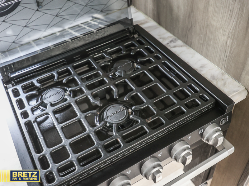 You will love everything about this spacious travel trailer, from the full rear bath to the king bed in the front bedroom! After you've whipped up some eggs and bacon on the three burner cooktop, you can dine at the theater dinette with a table. The walk-in pantry with coat hooks will be a big plus when packing for the week, and you'll find plenty of storage space in the bedroom as well, including redesigned shirt closets. The 16' power awning with LED lights will create much wanted shade during the day, and an inviting space at night. If the weather isn't cooperating, you'll find an entertainment center inside with an LED TV for movie night!