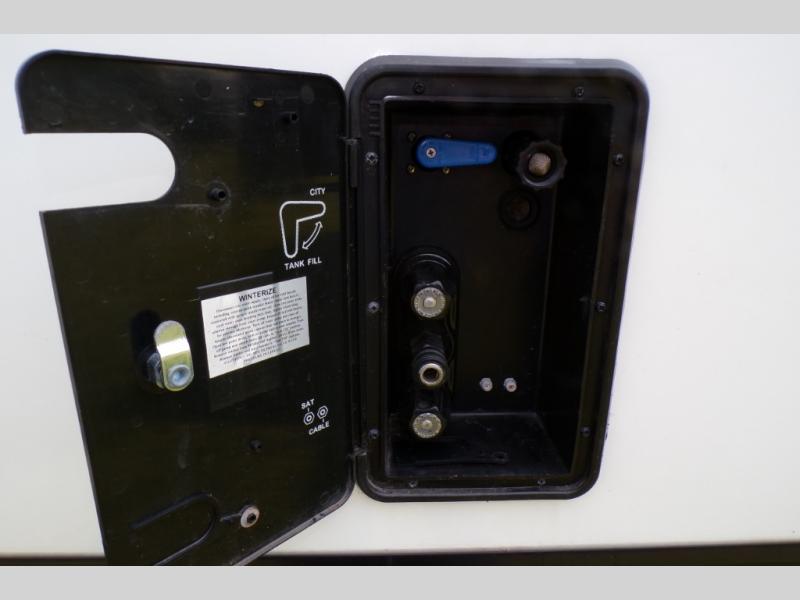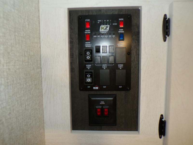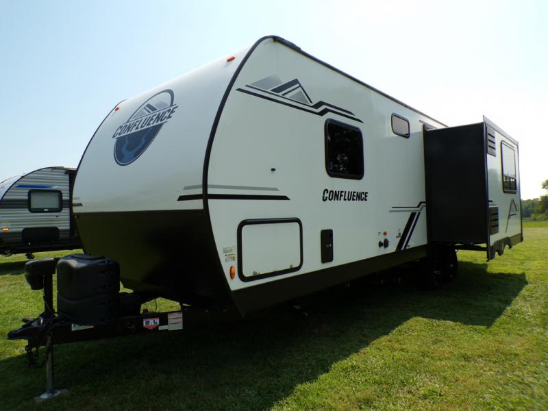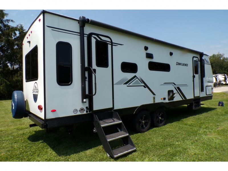With any Confluence travel trailer by KZ you will find a white exterior fiberglass that is not only eye-catching, but easy to keep clean as well. The protective front diamond plate will help protect your trailer from rock and debris on the way to the campground, and the four stabilizer jacks will make for easy set-up once you arrive. Each model includes the Arctic Package that features a heated, insulated, and enclosed underbelly with 12V heat pads and enclosed dump valves so you can camp well into the colder months. These pet-friendly models include a leash latch that will also double as a beverage opener, and there is an outside shower to fill the dogs water bowl. You will also enjoy the multi-media entertainment system with a DVD player, two 6.5" interior speakers, and an LED TV for those rainy days. Start a new adventure today in a Confluence trailer trailer!