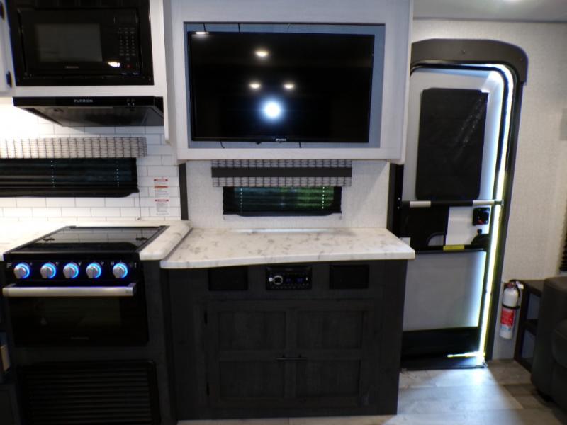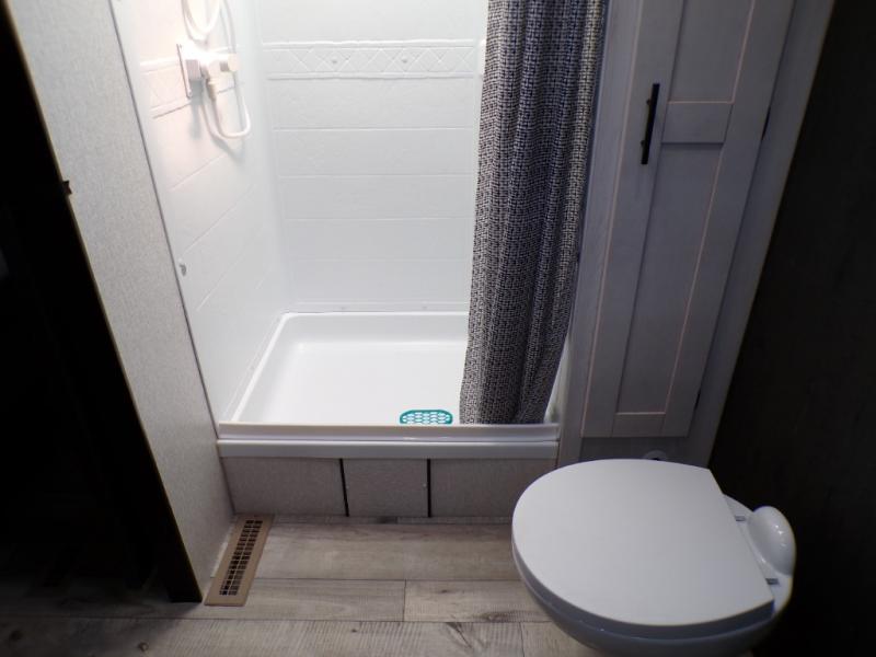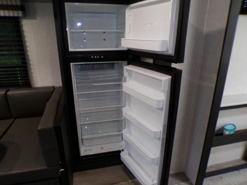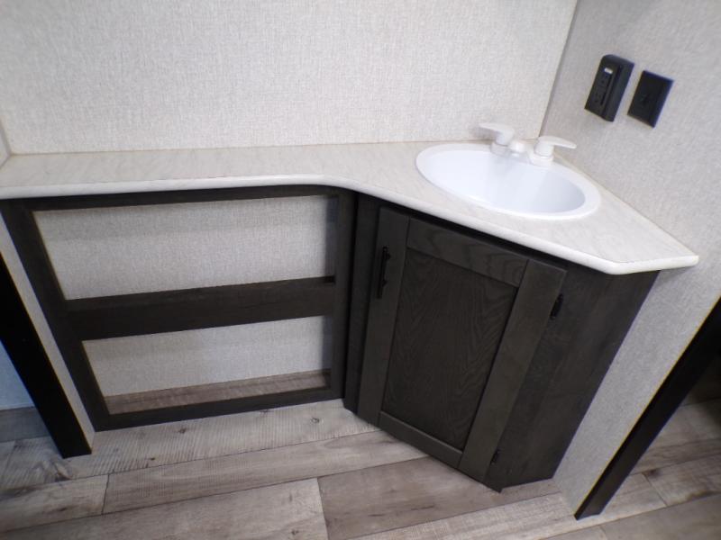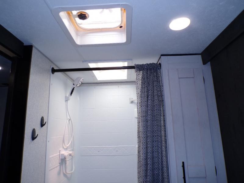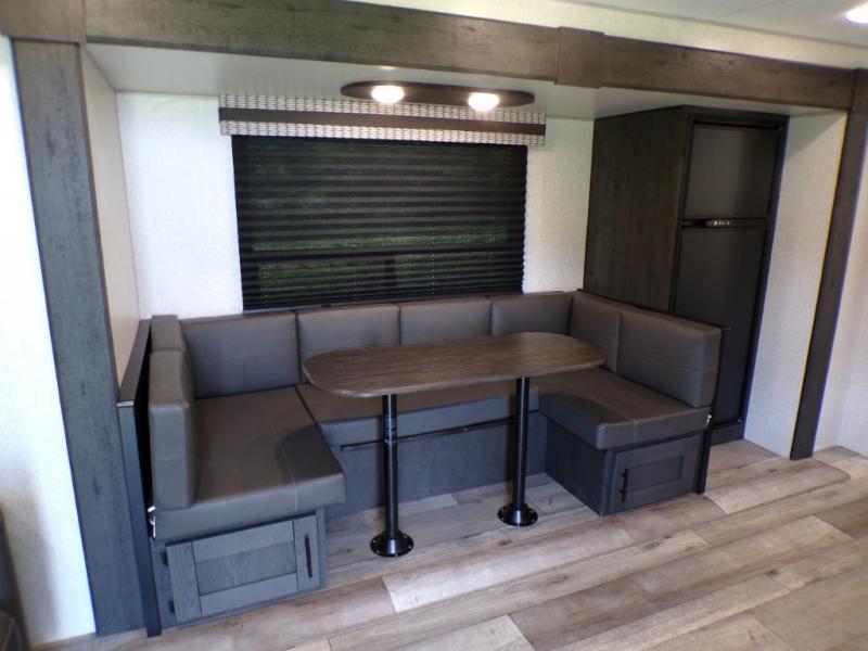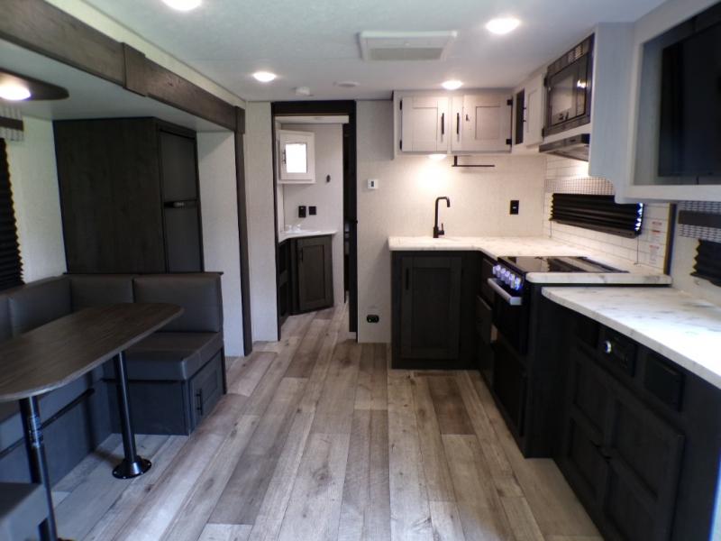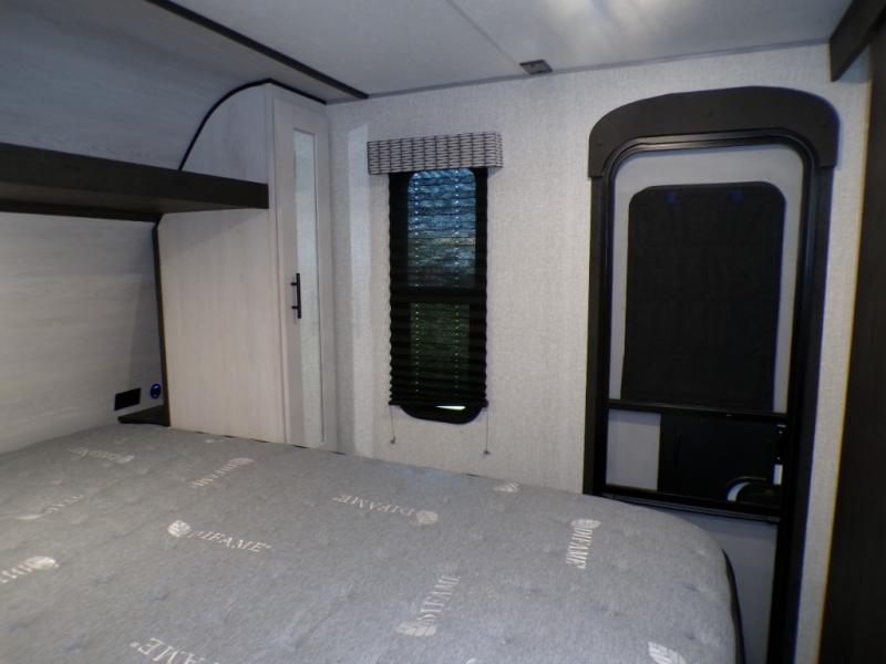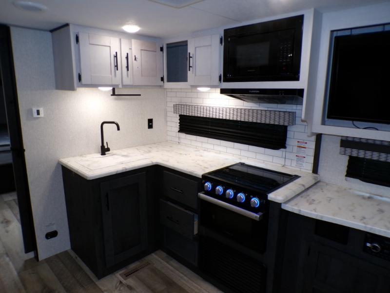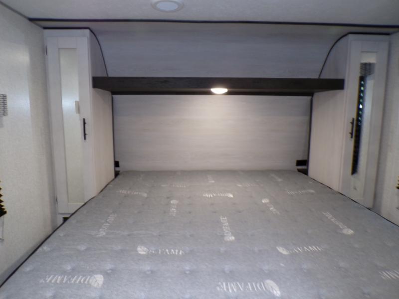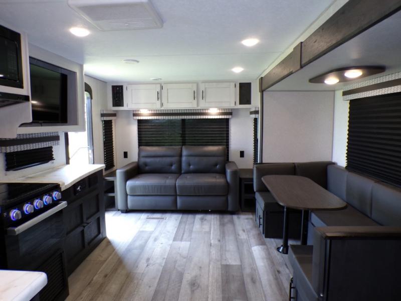 This dual entry travel trailer will end your search for the perfect RV that can sleep six each night. The rear living area includes a 70" sofa and a U-shaped dinette so your crew can enjoy movie night with the LED TV. The kitchen includes everything you need to prepare meals each day, including a three burner cooktop, a microwave oven, and plenty of counter space. The walk-through bath will create a front master bedroom you are sure to love. Here, you'll find a king bed, redesigned shirt closets, and your own exterior entry door for convenience.