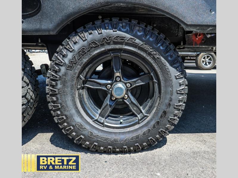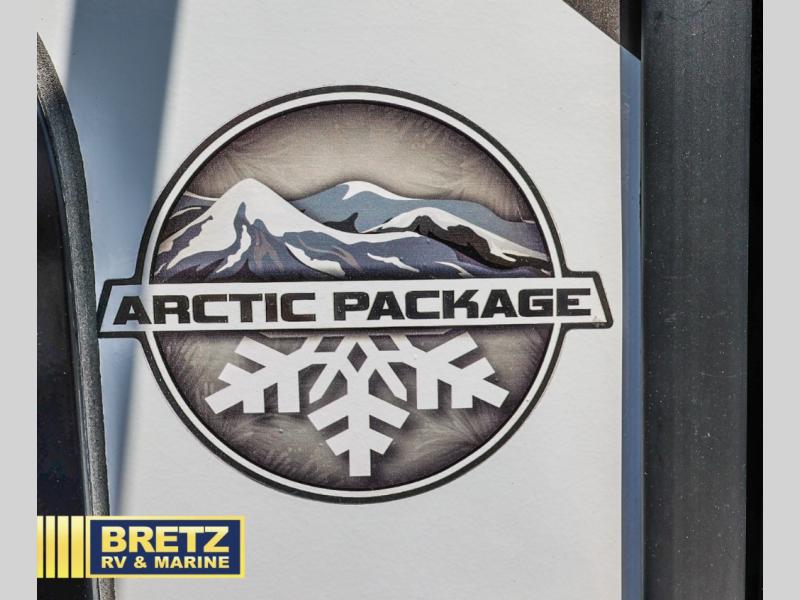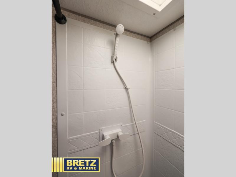 This travel trailer can comfortably sleep eight to nine people, so invite more friends to tag along! Within the large slide out you'll find the sofa and booth dinette that sits directly across from the LED TV. You can also choose to add the optional 30" fireplace to make it more cozy. Your guests will love the double-size bunks, and the full bath is right next to the bunks to make night time bathroom breaks easier than ever. This model includes a three burner cooktop and a microwave oven indoors, and an outside griddle at the outside kitchen so you can choose where you want to cook each day. You'll appreciate the pass-through storage for fishing poles, hiking gear, and extra lawn chairs!