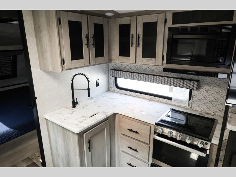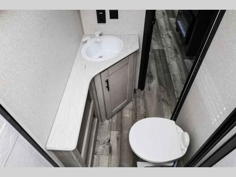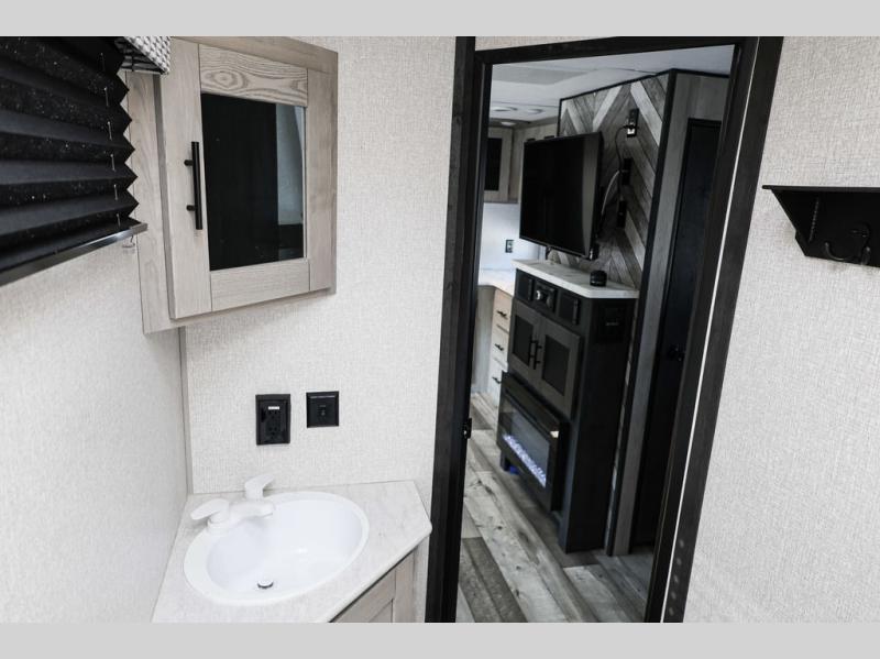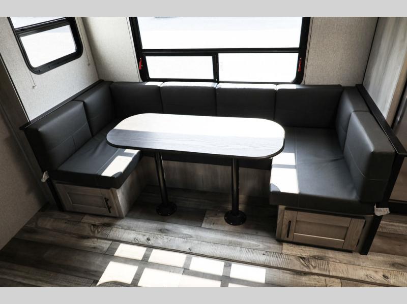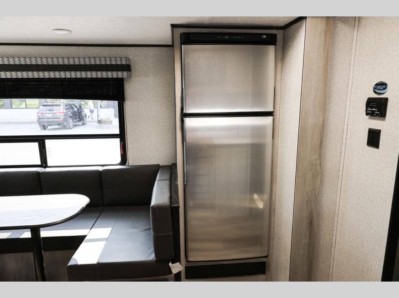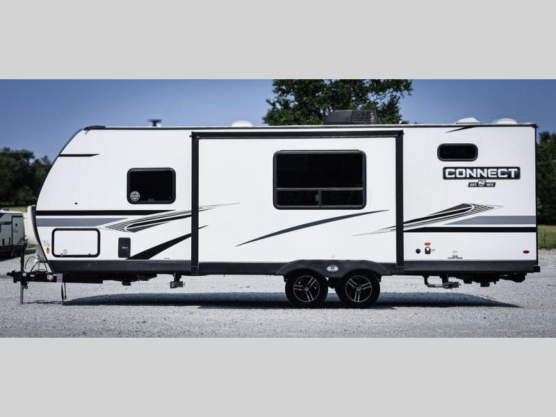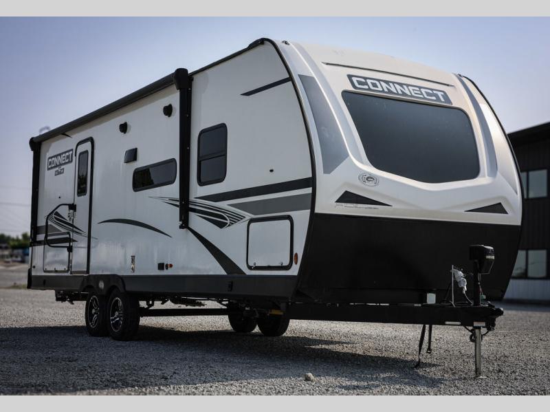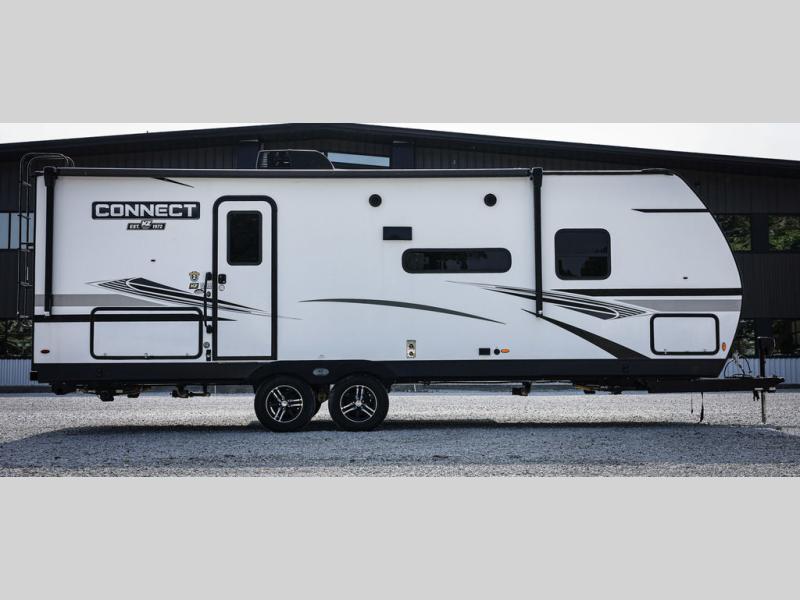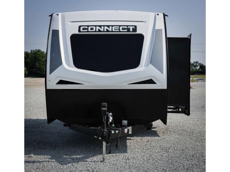 You will love spending your time in this Connect travel trailer because it has a U-shaped dinette directly across from the LED TV and 30" fireplace, so you can watch a show while you eat dinner. The kitchen is outfitted with a stainless steel microwave, residential faucet with spring sprayer, three-burner range with oven, and 8-cubic foot refrigerator, and there is also a kitchen skylight to give you more light to see what you're doing. Another skylight exists in the bathroom above the 30" x 36" shower, and the king-size bed in the front bedroom will deliver a very comfortable night of sleep. The more time you spend outside, the more you'll appreciate the 18' power awning with LED lights, and the exterior also has preparations for an outdoor entertainment center.