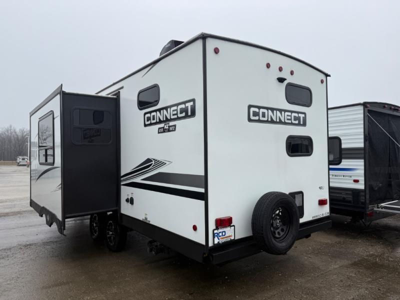 You will love spending your time in this Connect travel trailer because it has a U-shaped dinette directly across from the LED TV and 30" fireplace, so you can watch a show while you eat dinner. The kitchen is outfitted with a stainless steel microwave, residential faucet with spring sprayer, three-burner range with oven, and 8-cubic foot refrigerator, and there is also a kitchen skylight to give you more light to see what you're doing. Another skylight exists in the bathroom above the 30" x 36" shower, and the king-size bed in the front bedroom will deliver a very comfortable night of sleep. The more time you spend outside, the more you'll appreciate the 18' power awning with LED lights, and the exterior also has preparations for an outdoor entertainment center.