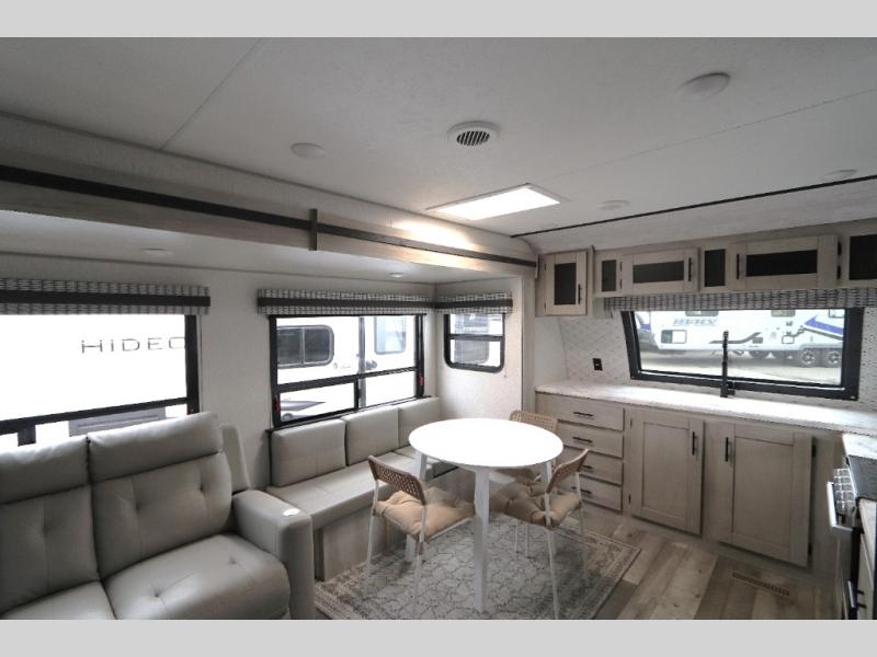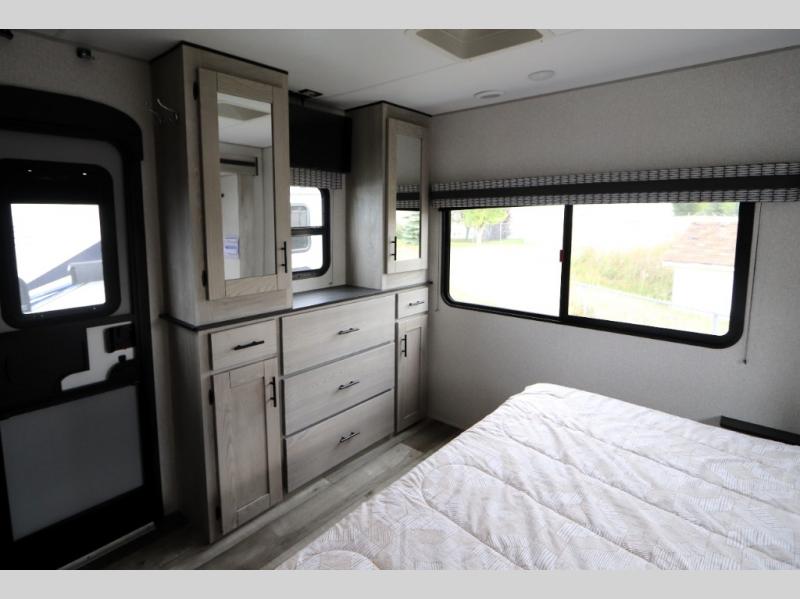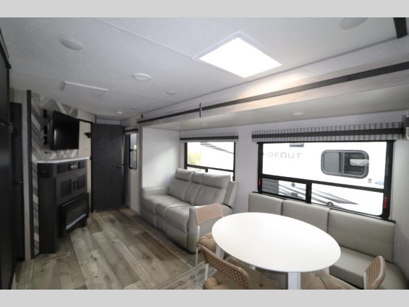 You can use this Connect travel trailer whenever you want to get away! You will remain comfortable each night sleeping in the rear master suite, and this bedroom area even has the second exterior entry door so that you can slip out for your morning run easily. The front kitchen has a full-width countertop for lots of extra space to chop veggies and prep meals, and the large slide in the main living area holds the booth dinette and 70" sofa. These pieces of furniture rest across from the fireplace for a cozy evening with a cup of coffee, and there is a walk-in pantry where you can grab snacks.