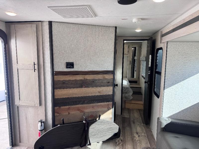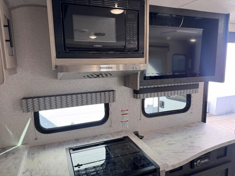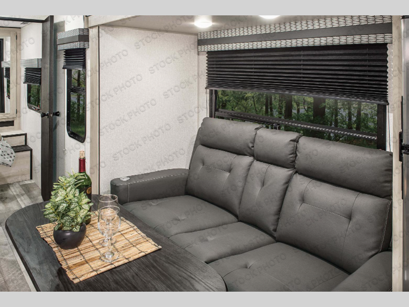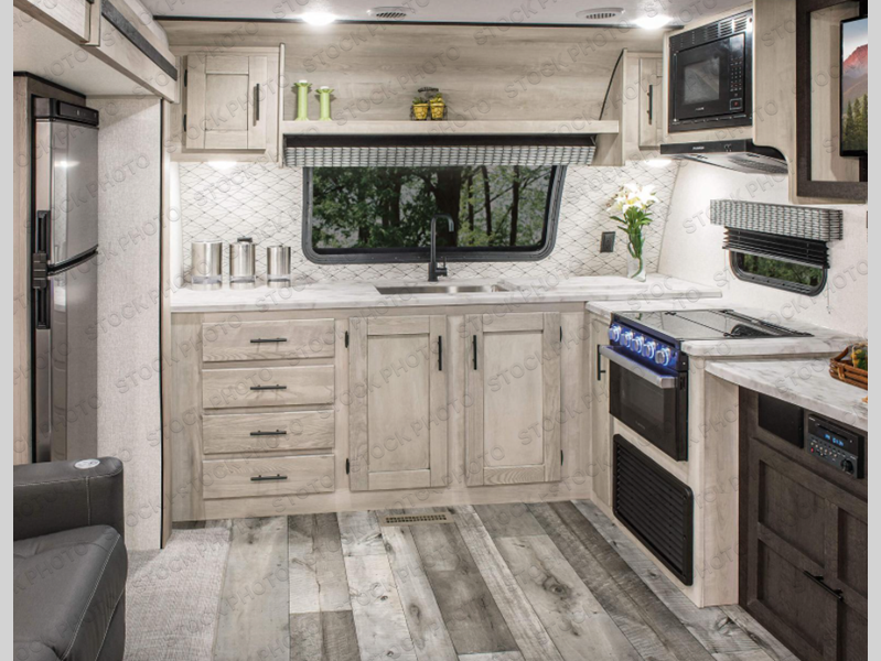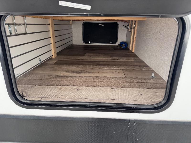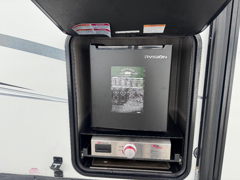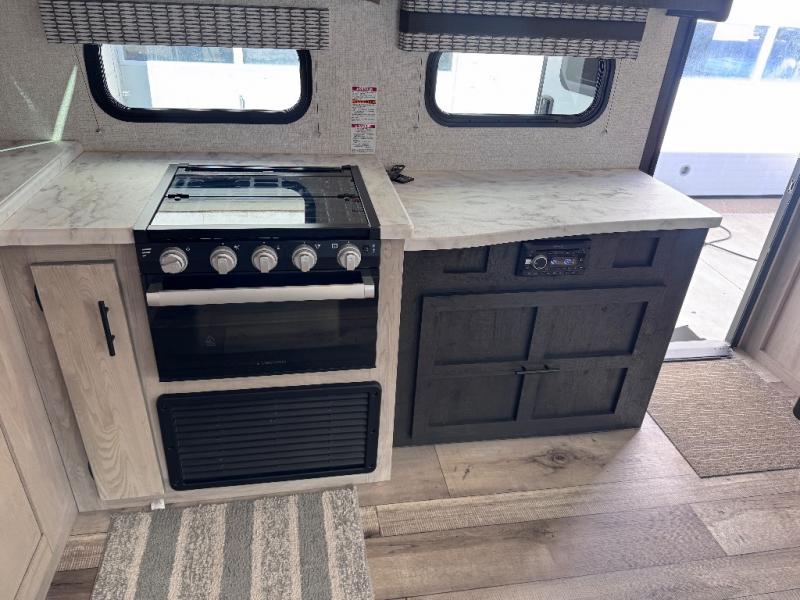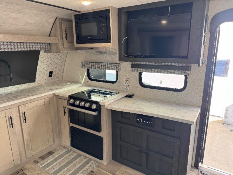 When you aren't hiking, fishing or shopping in town, you can relax inside this cozy travel trailer. There is theater seating with USB ports to charge your tablet, and a table in front to dine at. The chef will love the front kitchen with lots of counter space for preparing meals as well as drying the dishes beside the large sink. The 10 cu. ft. refrigerator and the pantry will hold your food items, and there is linen storage in the full bathroom with a radius shower. You will sleep like a queen in your own bedroom in the rear. Outside, you can enjoy the weather protected from the elements under the 18' power awning that includes an LED light strip so that you can relax into the evening. The mini outside kitchen with a griddle allows you to make meals while outdoors, and the pass-through storage in the rear gives you space for the larger camping gear.