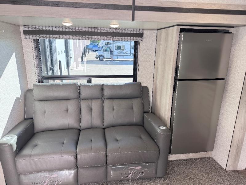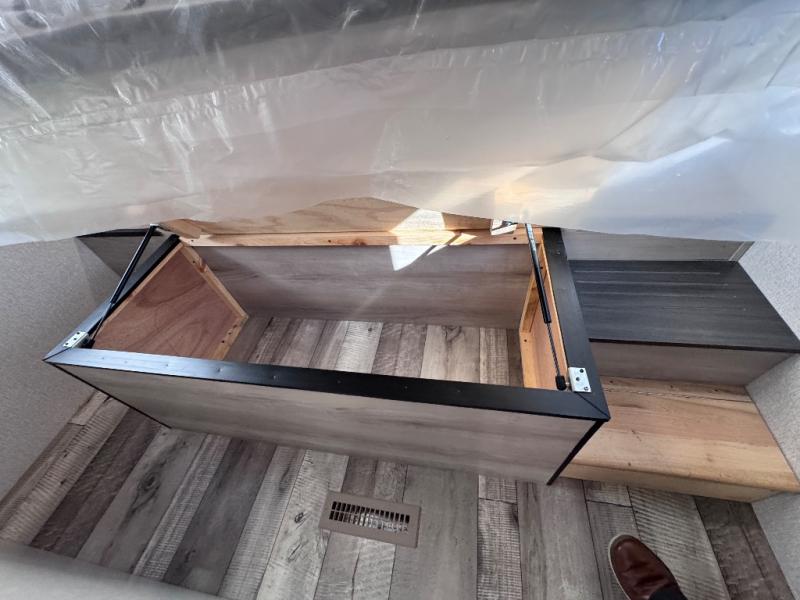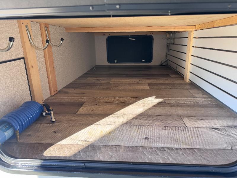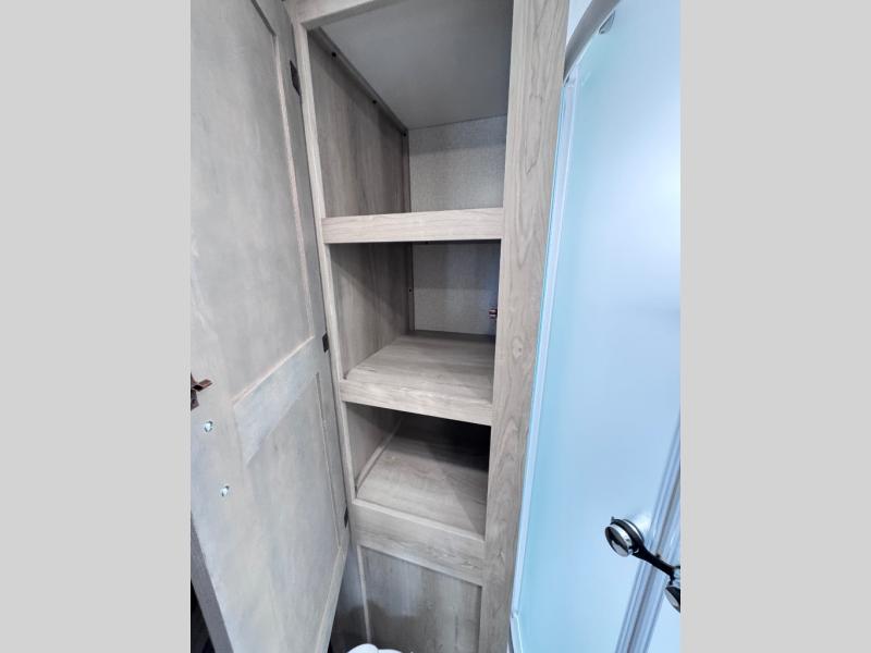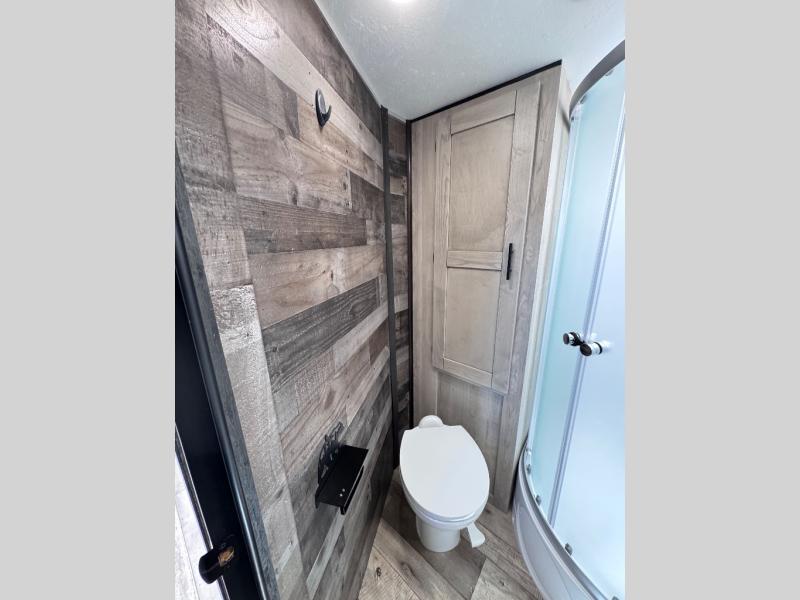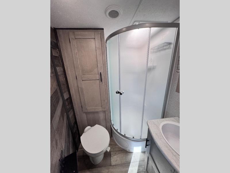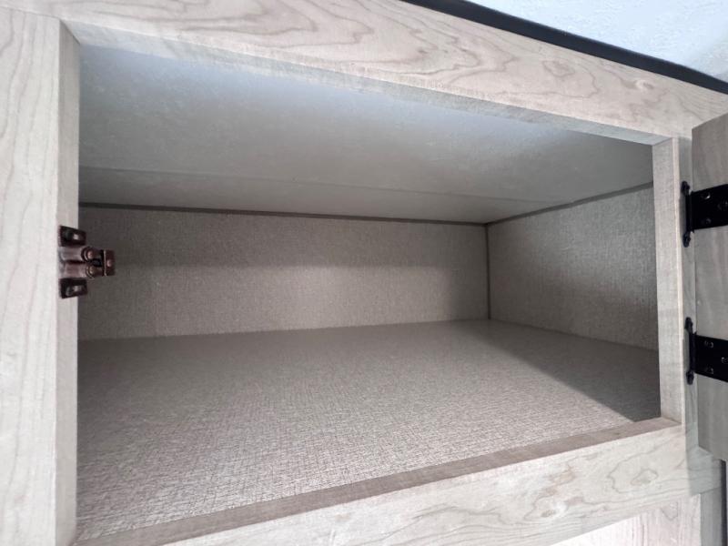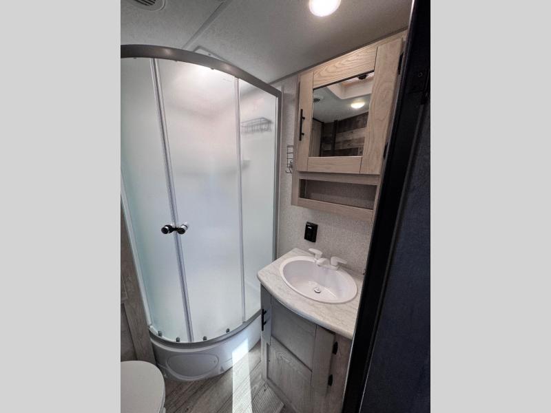 When you aren't hiking, fishing or shopping in town, you can relax inside this cozy travel trailer. There is theater seating with USB ports to charge your tablet, and a table in front to dine at. The chef will love the front kitchen with lots of counter space for preparing meals as well as drying the dishes beside the large sink. The 10 cu. ft. refrigerator and the pantry will hold your food items, and there is linen storage in the full bathroom with a radius shower. You will sleep like a queen in your own bedroom in the rear. Outside, you can enjoy the weather protected from the elements under the 18' power awning that includes an LED light strip so that you can relax into the evening. The mini outside kitchen with a griddle allows you to make meals while outdoors, and the pass-through storage in the rear gives you space for the larger camping gear.