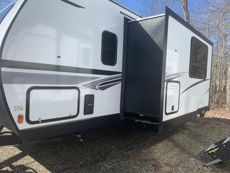 Camping can be comfortable when you park this trailer at the campsite! You will have sleeping space for eight between the popular double-size bunks next to the full bathroom, the queen Murphy bed up front with a sofa to utilize during the daytime, and the U-shaped dinette within the slide out which also includes a wardrobe/storage cabinet. The cook has a galley kitchen with full amenities including a pantry and L-shaped counter with a large sink. They also have the choice of making meals outdoors on the outside kitchen with a griddle. You will find outside storage in the front pass-through compartment for your larger outdoor gear, plus the trunk door allows access to the interior.