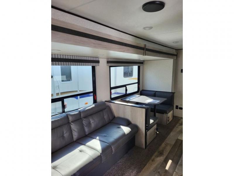 Headed to the RV park with your family and friends? Want enough space to allow overnight guests to stay the night on occasion? This trailer gives you double-size bunks, a 70" sofa and a booth dinette that offer extra sleeping space while you enjoy your own walk-around queen bed in the front private bedroom. You will also have dual wardrobes, and a TV mount to add your own TV. Everyone will stay refreshed and cleaned using the rear corner full bathroom, and fed by the cook that has an inside kitchen with full amenities including an L-shaped counter and a large sink. There is also a walk-in pantry with coat hooks next to the entry to utilize as a multi-purpose closet. And there is an outside kitchen with a griddle and a refrigerator, a 20' power awning with an LED light strip, and a pass-through storage for the larger camping items.